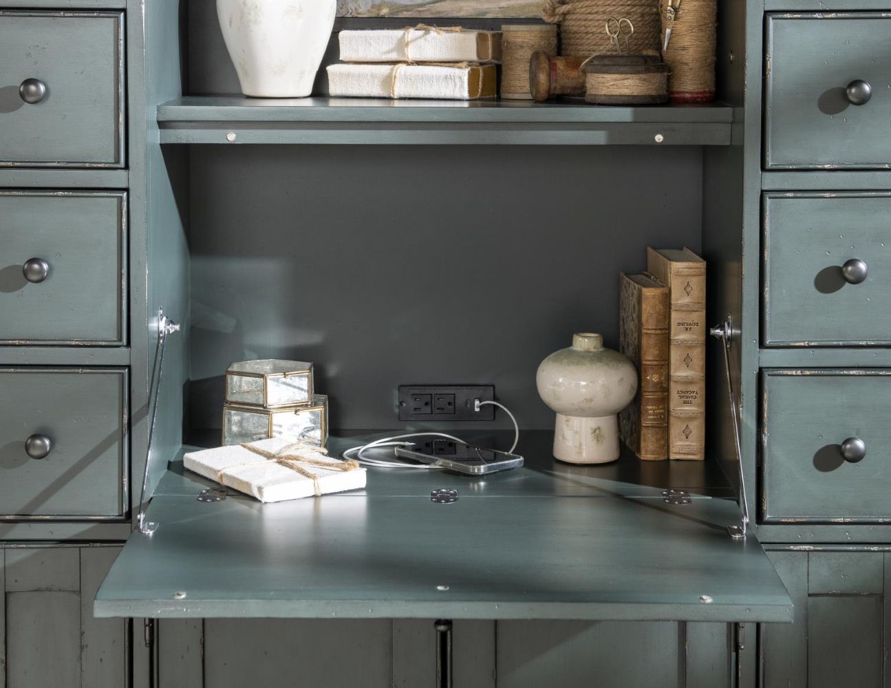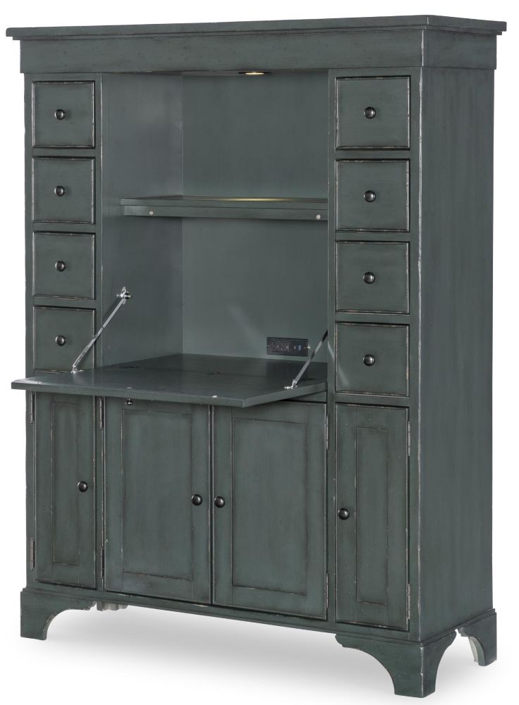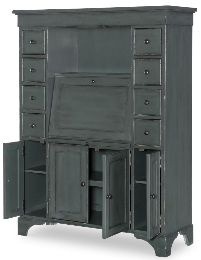 Combine the timeless elegance of classic design with modern organizational needs with the Secretary Cabinet. Finished in a rich, deeply distressed mallard green, this stately piece serves as a dedicated workspace, display cabinet, and storage hub all in one.