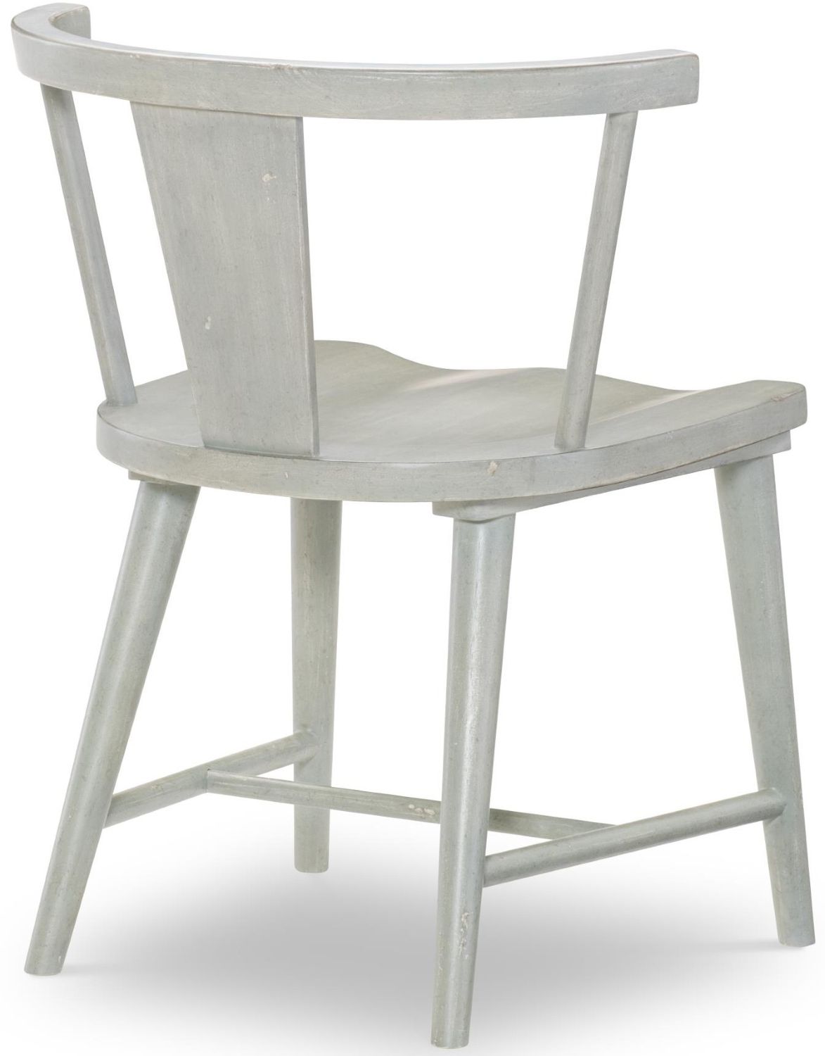 The chair features a clean, architectural splat back design that offers both style and sturdy support. Its unique Bellflower finish—a soft, muted blue grey—is applied over Red Oak veneers to let the natural wood grain peek through, creating a textured and eclectic look that works beautifully as a dining chair or a standalone accent piece.