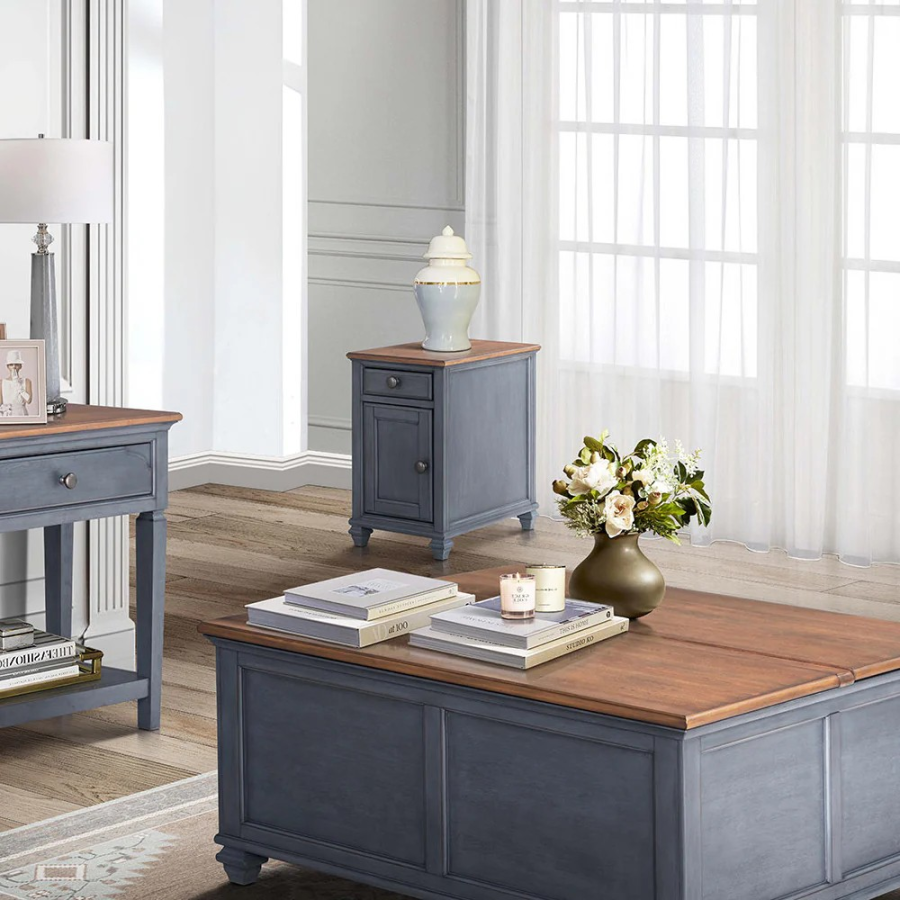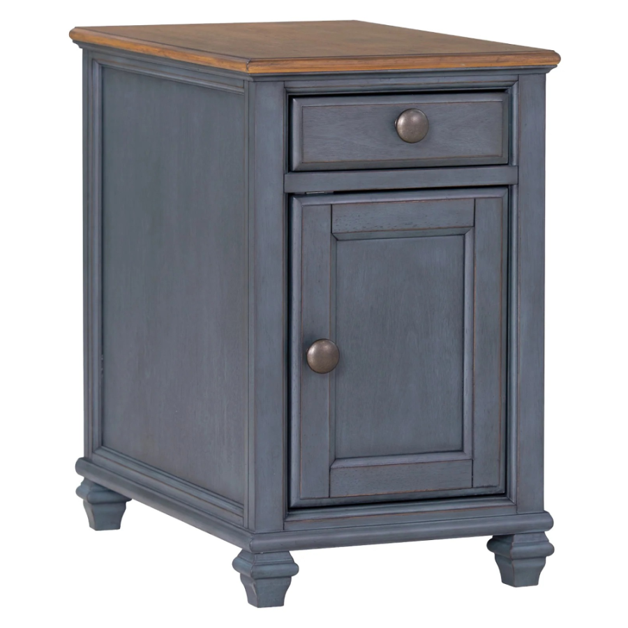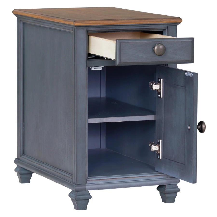 The Americana Chairside Table offers a charming blend of coastal and classic styles. Its Corduroy Blue finish and lightly distressed look are complemented by elegant brushed hardware, making it a timeless addition to any space. Perfect for bringing a touch of Americana charm right beside your favorite chair.