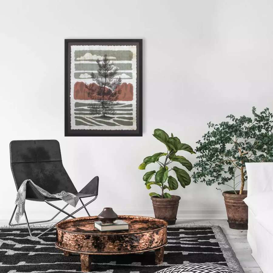 Part of the Angela Harris Collection. This tree print is deckled under glass and paired with a dark brown frame.