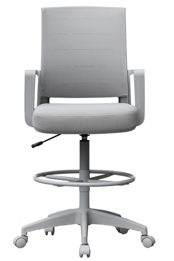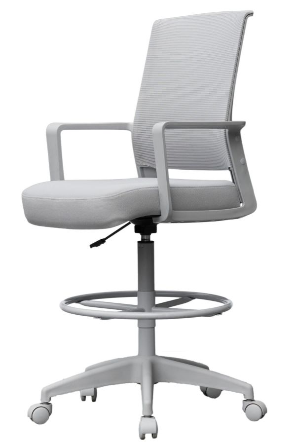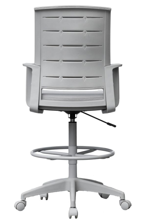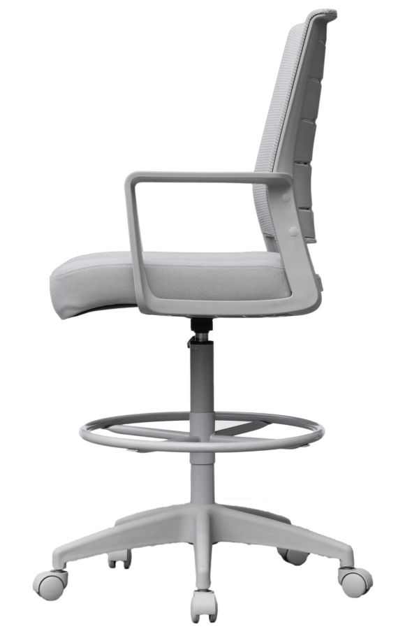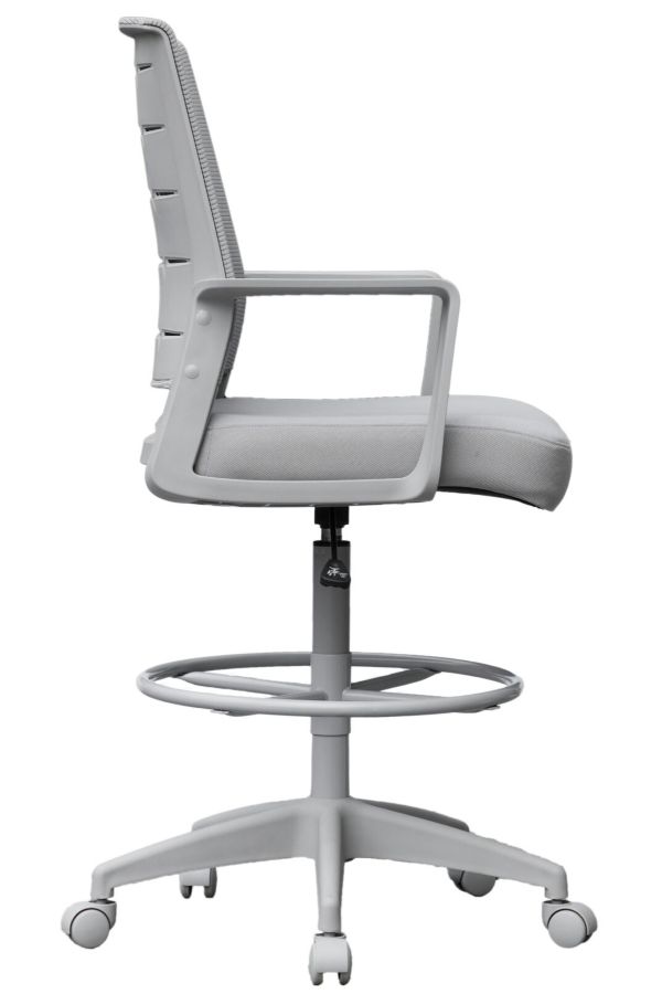 The stool is equipped with a pneumatic gas lift, allowing for effortless height adjustments to accommodate different workstation heights or personal preferences. It also features matching grey armrests and a sturdy, reinforced base, complete with a 20” footring for added leg support. Built to last, the stool supports individuals up to 275 lbs and is perfect for tasks that require elevated seating, offering a combination of style, functionality, and ergonomic support.