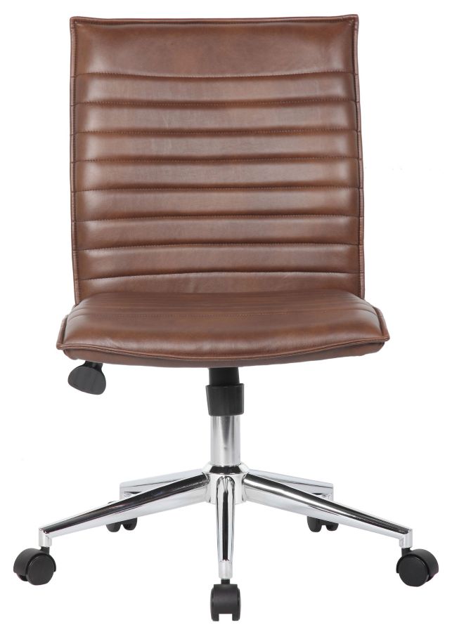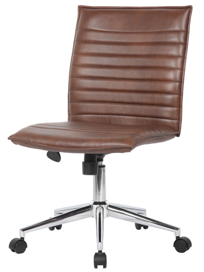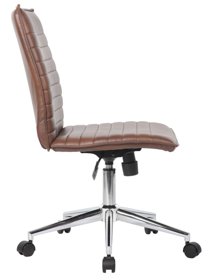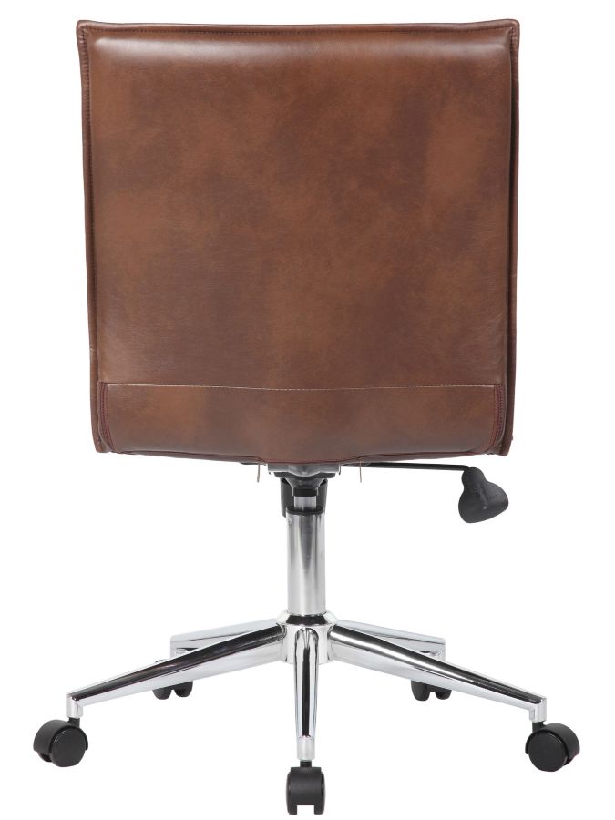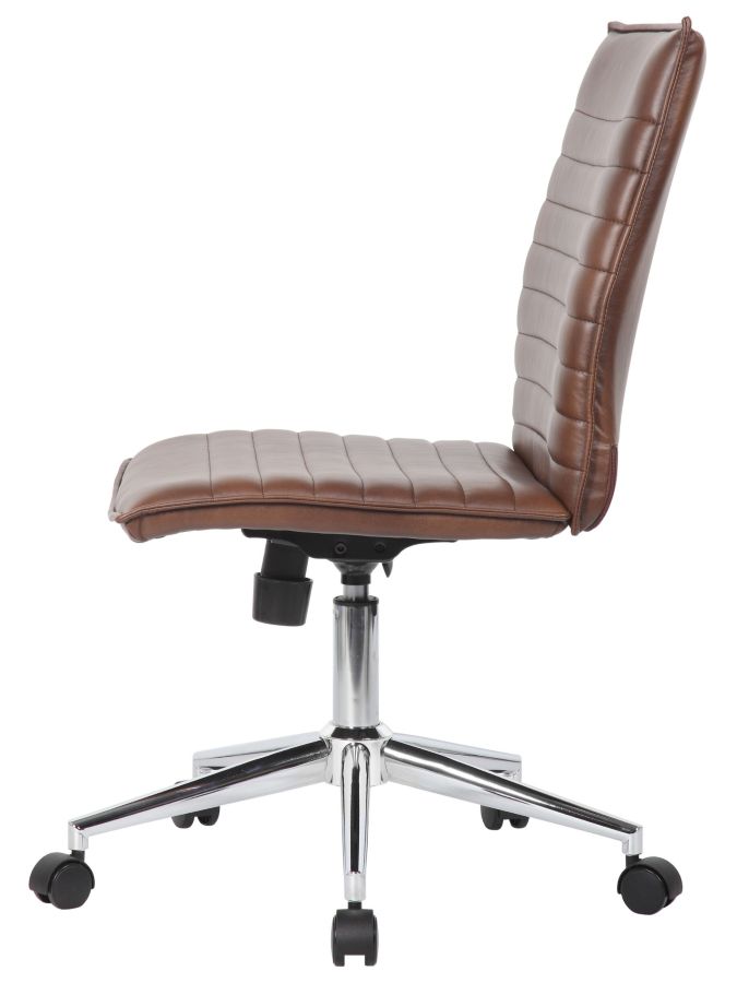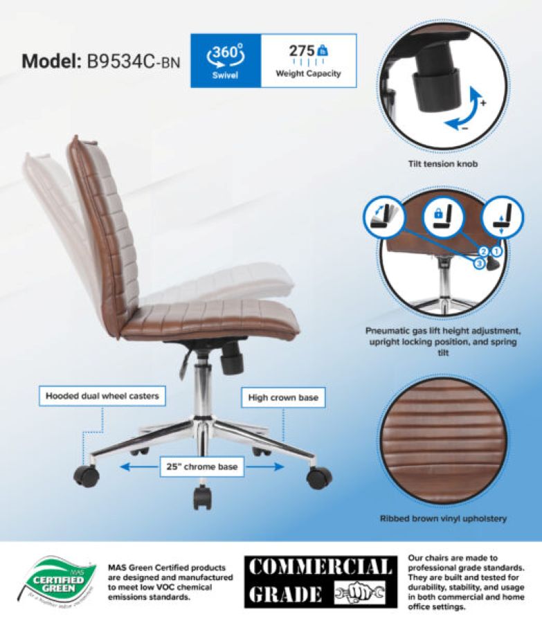 This task chair in brown vinyl is designed with a look that brings any room or office to the next level. The chair features a gorgeous and strong chrome 25 inch base with 2 inch nylon dual wheel castors that adds that perfect pop of metallic color to any room. In addition to looking fantastic, the chair also features a spring tilt mechanism, a pneumatic gas lift for easy height adjustability, tilt tension and an upright lock, while also boasting a weight capacity of 275 lbs.