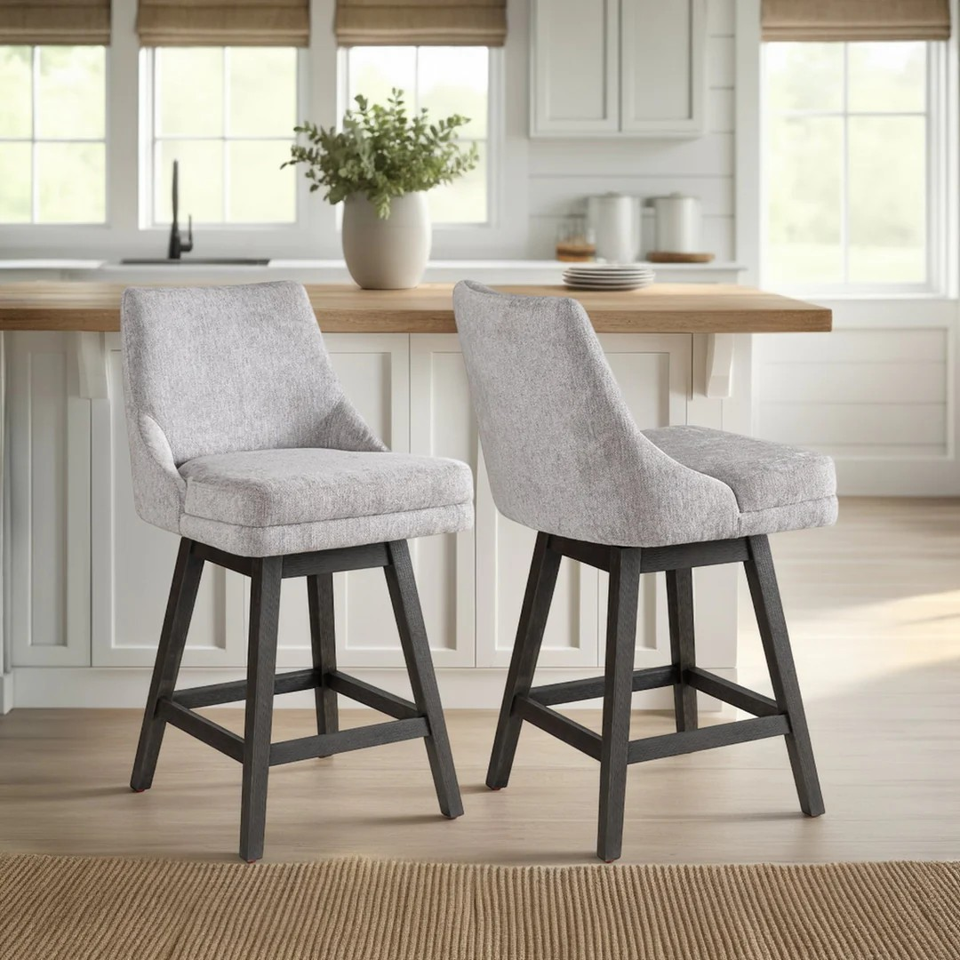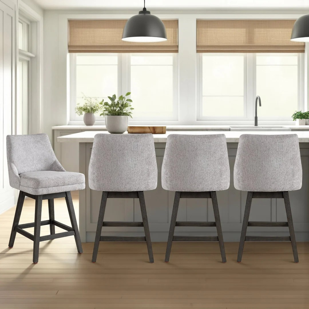 The Branson Bar Stool is the perfect combination of style, comfort, and functionality for your kitchen island, counter, or home bar. Designed with a modern transitional flair, this bar stool features a durable rubberwood frame with a stunning wire-brushed finish, adding warmth and texture to any space. The cushioned seat and low-back design are upholstered in high-quality polyester fabric, ensuring both durability and elegance. Available in 26-inch counter height and 30-inch bar height, the Branson Bar Stool offers exceptional versatility. The plush seat cushion provides superior comfort, while the 360-degree swivel mechanism allows for effortless movement. Its sturdy four-leg base includes plastic glides to protect your floors, making it a practical and stylish addition to your dining area. Choose from two sophisticated finishes: Brown Wood with Beige Upholstery or Gray Wood with Gray Upholstery, to match your interior decor. Perfect for kitchen islands or counters, the Branson Bar Stool offers a sleek and timeless solution for your seating needs. With a weight capacity of up to 250 lbs, this stool combines reliable craftsmanship and everyday luxury for your home. Assembly is quick and easy, requiring only a screwdriver and approximately 30 minutes with two people, so you can enjoy your new bar stool in no time.