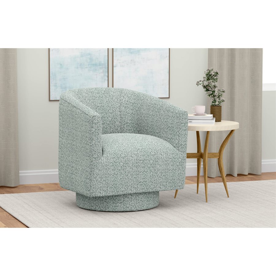 Get the chic, yet contemporary feel you’re looking for with the Brylee accent chair. The swivel base is stylishly upholstered to match the rest of the chair, while the barrel-shaped back invites you in. A well-tailored line of welting around the chair adds definition and a fashionable touch. Whether being the center of attention in your space, or matching with your existing décor, the three cool-toned fabric colors of the Brylee chair will add an easy update to your space.