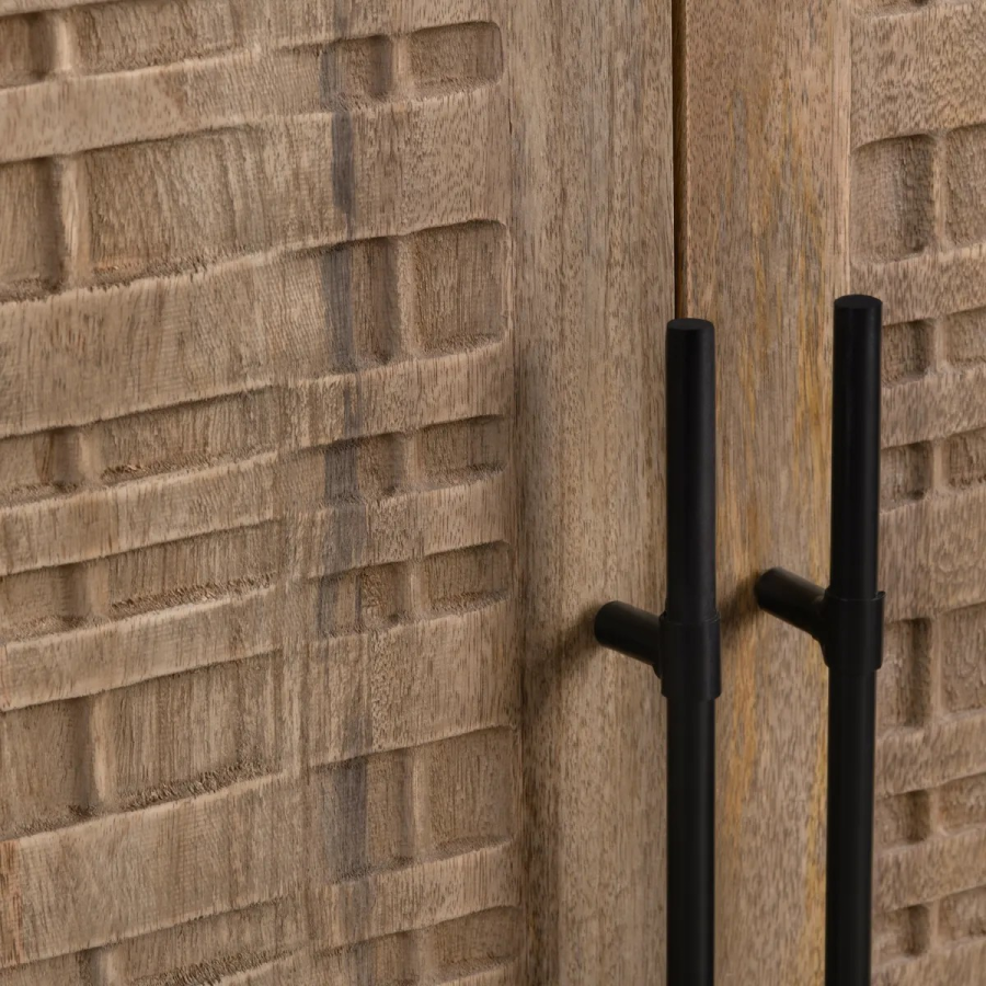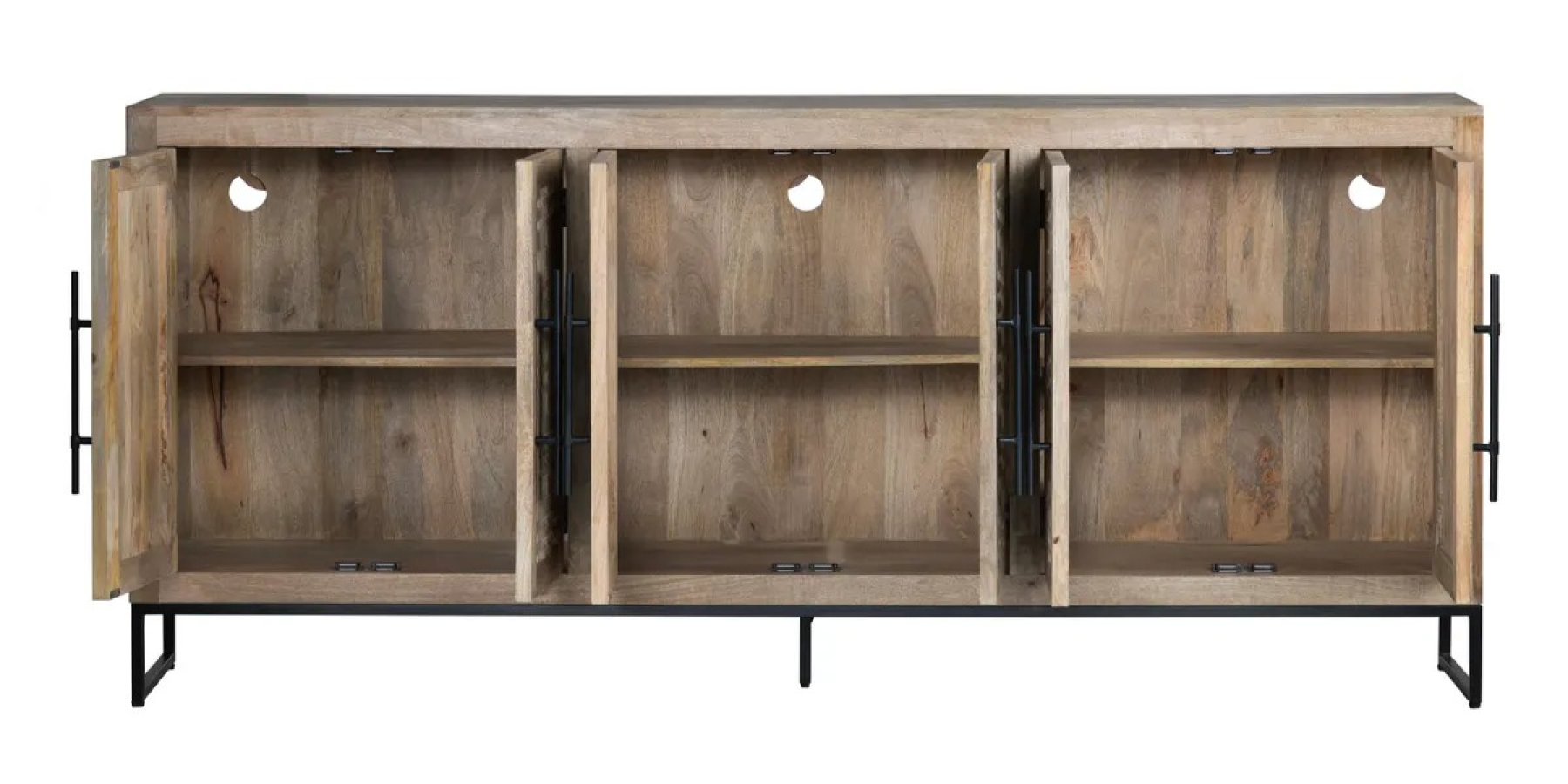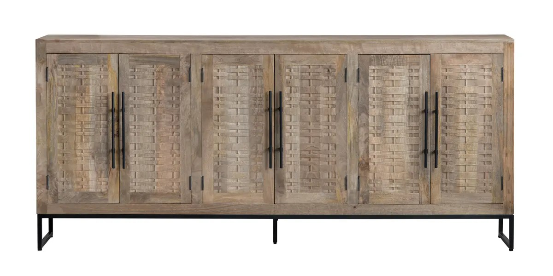 The Crestview Collection Capetown Sideboard is a stunning fusion of form and function. Crafted with meticulous attention to detail, this six-door sideboard boasts a harmonious blend of mango wood and sleek metal accents. Its captivating basket weave pattern on the doors adds an element of sophistication to any space.