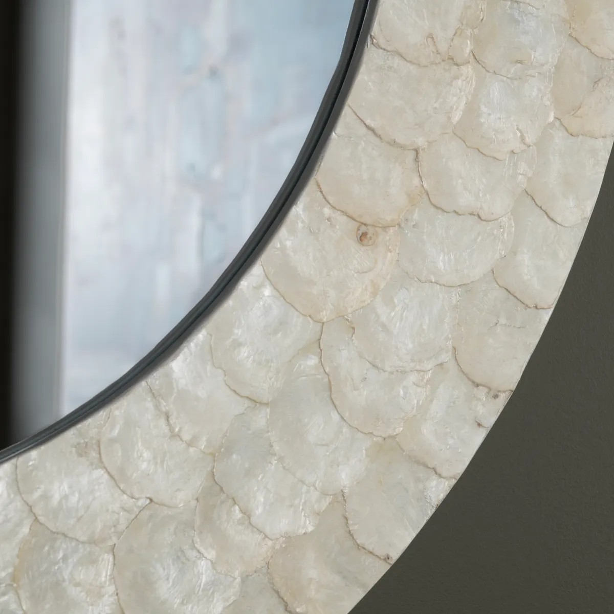 Introduce a serene and sophisticated ambiance into your home with the Capiz Glow wall art by Crestview Collection. Featuring a classically round silhouette, this mirror serves as a soft and soothing focal point in any room, radiating a calm, coastal energy that echoes the peaceful rhythm of the ocean. The standout feature of this mirror is its frame adorned with natural Capiz shell, expertly arranged to highlight the organic beauty and delicate luster of this seaside material. Known for its subtle iridescence and pearly finish, Capiz shell brings a light and airy texture to the piece, making it a perfect fit for interiors that favor beach-inspired style or soft transitional aesthetics.