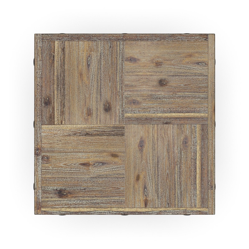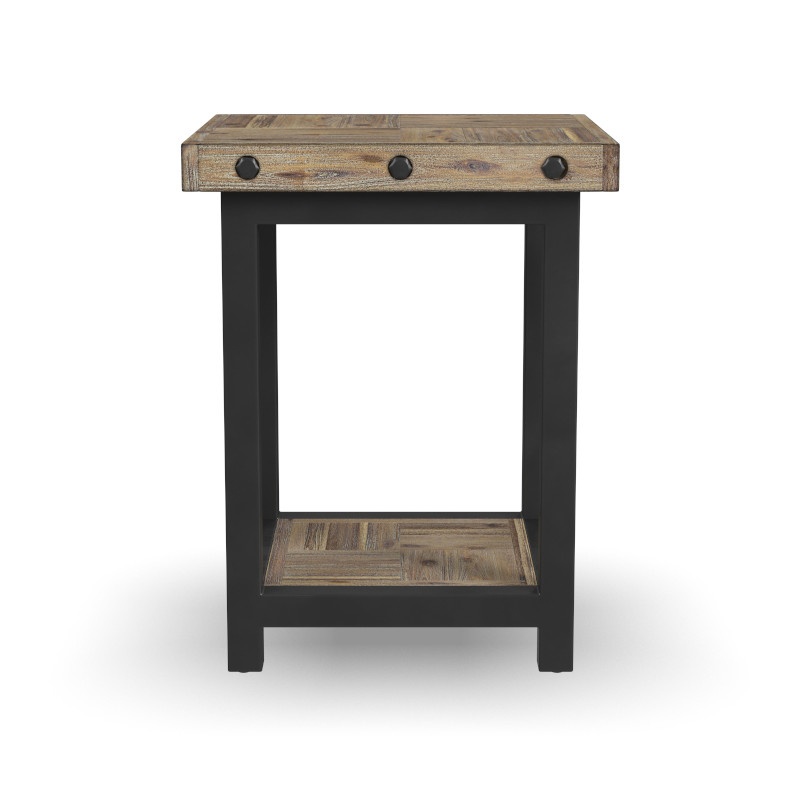 Instantly add inviting character to living spaces with the Carpenter chairside table. Sized perfectly for smaller spaces, this table still has plenty of room to hold your favorite book and cup of coffee. An open lower shelf offers an additional area for storage or to display decor. Inspired by the look of vintage workbenches, this chairside table features distressed acacia wood planks for a reclaimed look, hand-worked metal frames and exposed bolt heads that are finished to resemble aged, oiled steel.