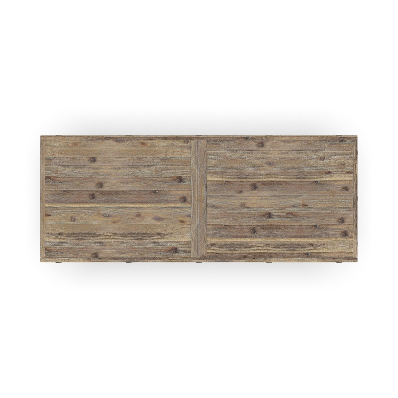 - Solid wood planks are distressed for a reclaimed wood look