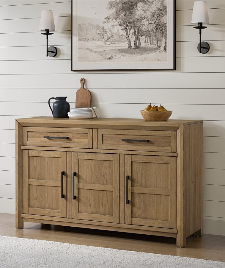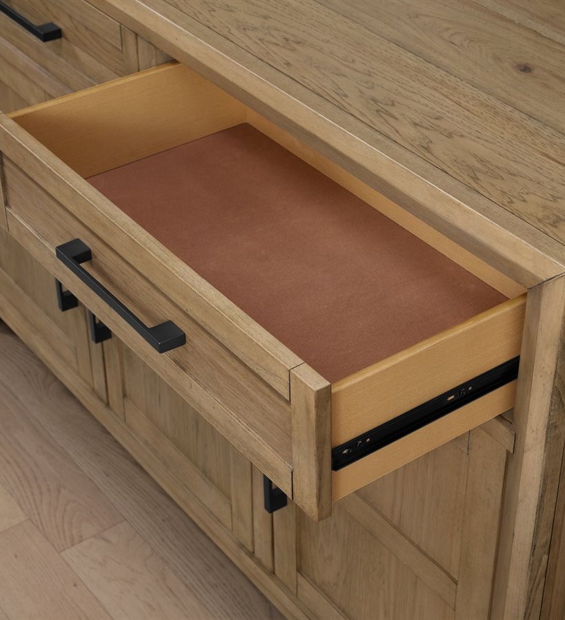 The Charleston dining collection blends farmhouse craftsmanship with modern style in a warm mix of natural hickory brown and bold black finishes. The coordinating server adds generous storage with paneled doors and metal bar hardware. Built from hickory veneers and hardwood solids, Charleston delivers rustic-modern character and durable design made for everyday dining.