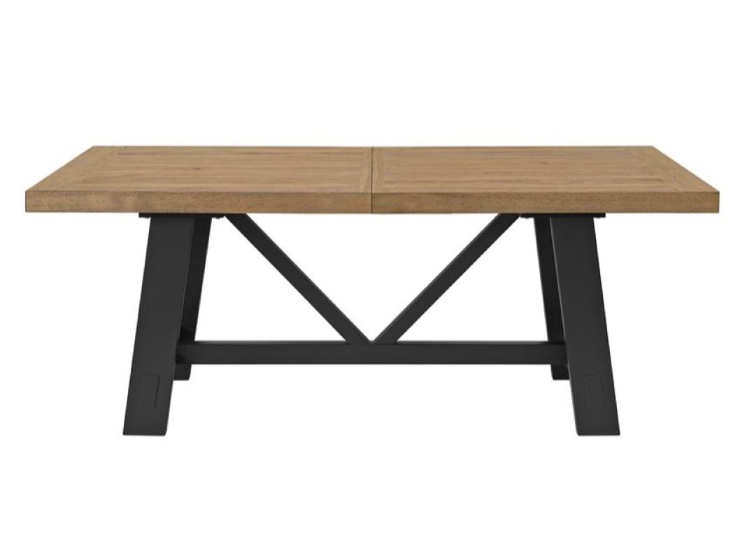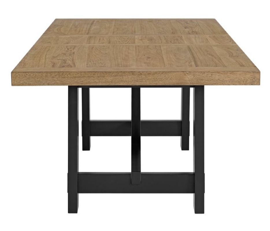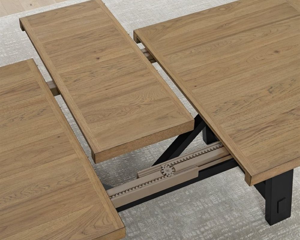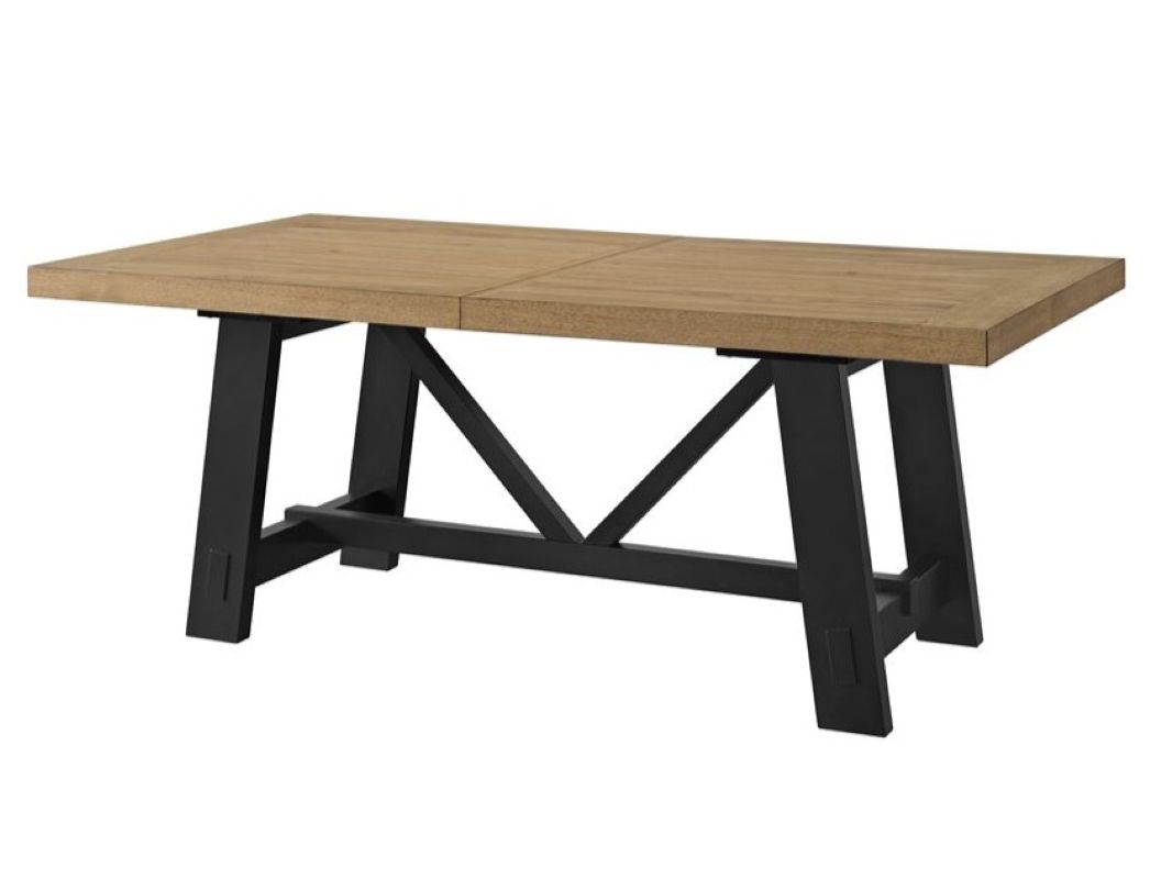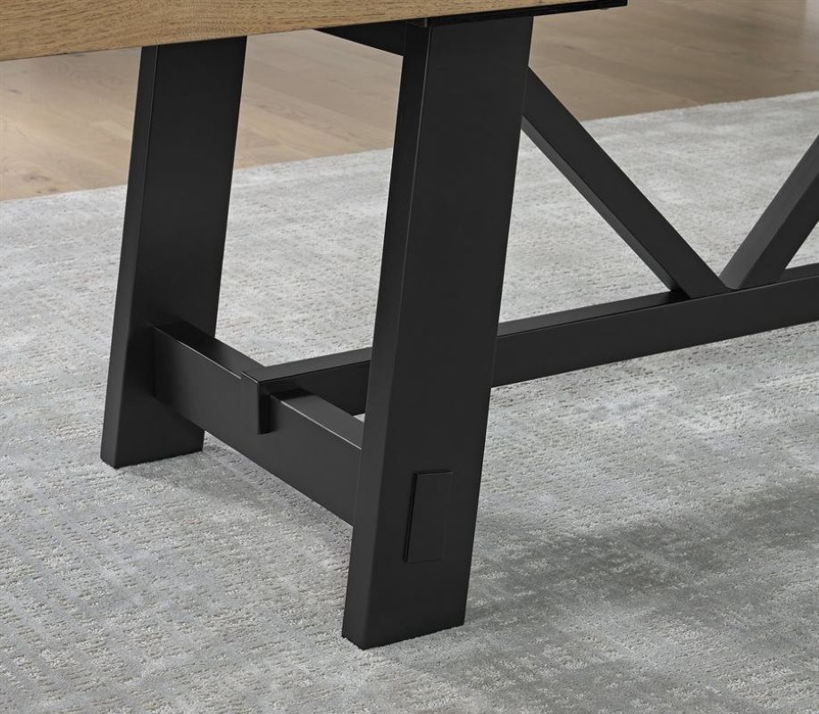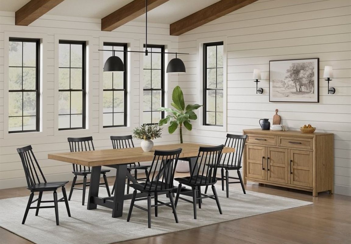 The Charleston dining collection blends farmhouse craftsmanship with modern style in a warm mix of natural hickory brown and bold black finishes. The trestle table features faux mortise-and-tenon joinery that nods to traditional woodworking, while smooth extension mechanisms make them easy to expand for gatherings.