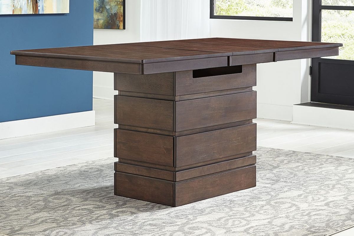 Chesney Dining translates the rugged beauty of natural hardwood into contemporary design. Inset horizontals break up the heft of the block pedestal base to add structural interest, showcasing simple lines and smooth rounded edges. The unique table design in reminiscent of old-world refectory tables with modern conveniences. The table features an 18" self-storing butterfly leaf and equalizing cable glides for quick and easy conversion. The table base is convertible to add height, transforming the table from standard dining height to gathering height. The base also includes two concealed storage drawers.