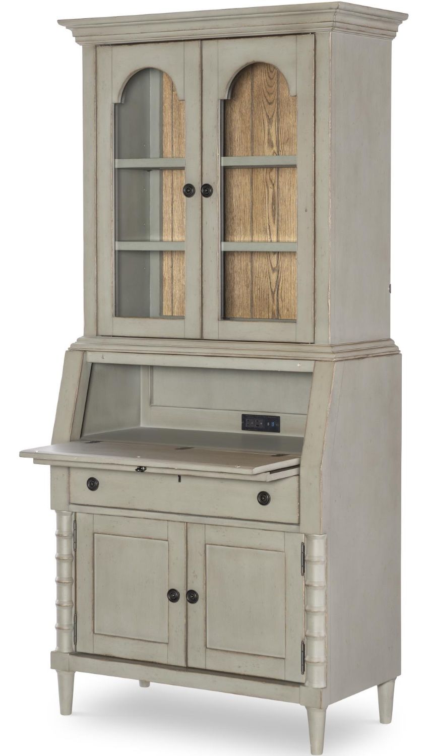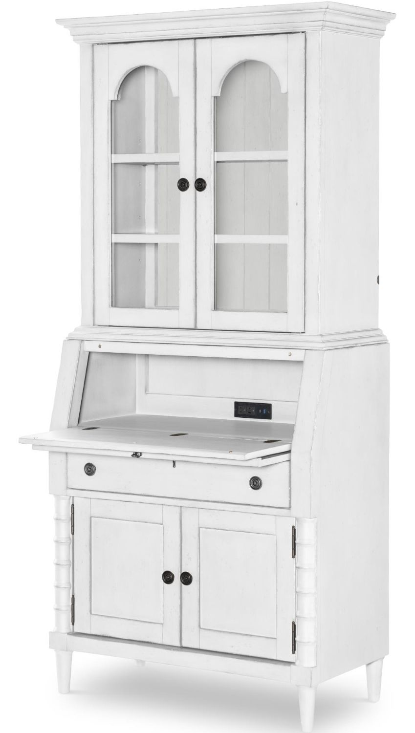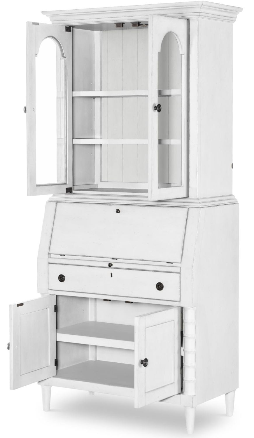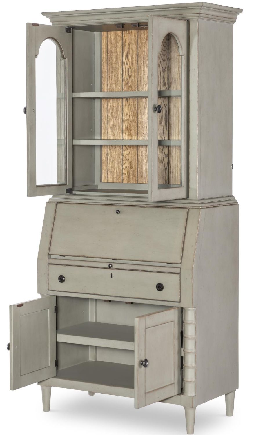 This Secretary Cabinet Complete is designed to feel like a cherished antique find, blending classic Victorian and Shaker styles with modern functionality. The cabinet is finished in a beautifully distressed Picket Fence white or Northern Moss and Barnwood, applied over Oak veneers and select hardwoods to highlight the natural wood grain. Its slender, tall silhouette makes it a versatile addition to a dining room, home office, or living area, serving as both a sophisticated display case and a functional workspace.