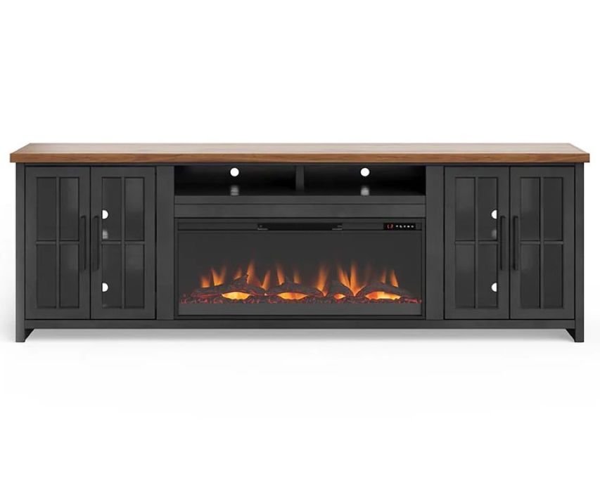 The Essex 97" Fireplace TV Stand combines coastal cottage charm with a modern farmhouse flair, offering a stylish centerpiece for your living space. It supports TVs up to 100" and provides ample storage for all your media essentials. Finished in an eye-catching Black and Whiskey, this unit includes a 42" fireplace insert that heats up to 400 square feet, featuring both crystal rocks and a traditional log set.