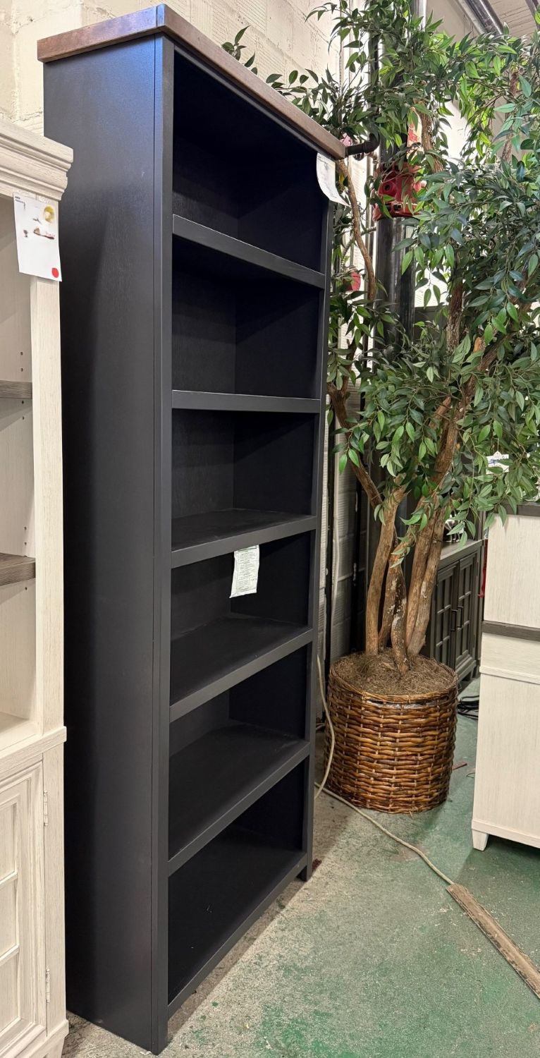 The Essex Bookcase stands at an impressive 86 inches, offering a harmonious mix of coastal cottage and modern farmhouse aesthetics. Its eye-catching Black and Whiskey finish, coupled with six spacious shelves, provides a stylish and functional addition to any home office.