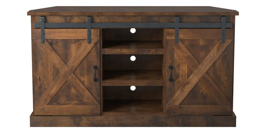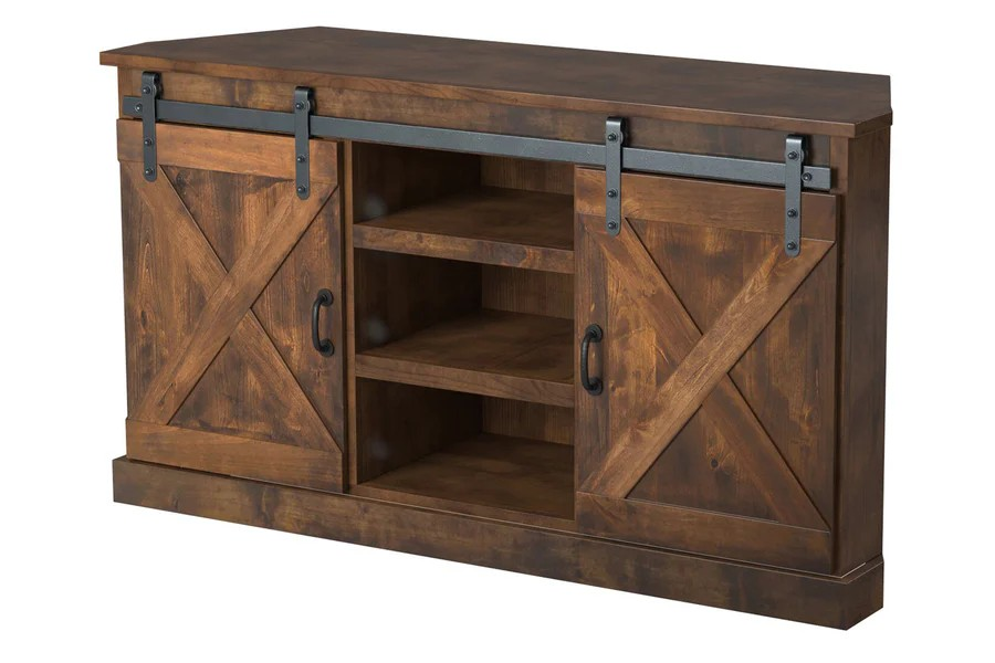 The Farmhouse 56" Corner TV Stand combines classic charm with functional design. Featuring rolling barn doors and stylish metal accents, it fits perfectly into any rustic decor. This stand supports TVs up to 60" and offers ample storage for all your media components.