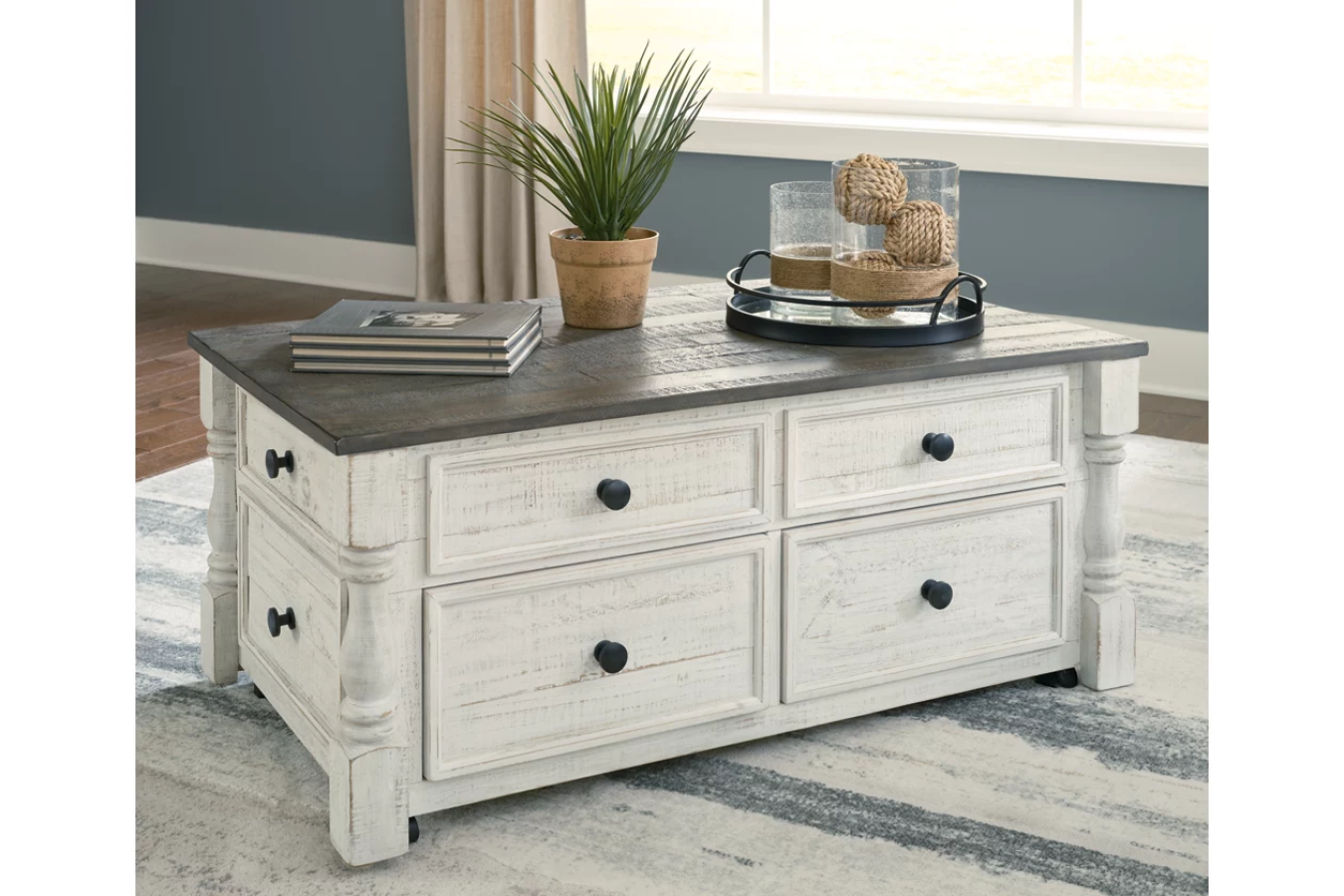 What a fresh interpretation of country classic style. Inspired by American farmhouse craftsmanship, but with an elevated sensibility, this lift-top coffee table blends distinctive details such as turned post accents and raised drawer fronts for a substantial look that feels right at home. Those who appreciate rustic character should take note of the table’s thick crown moulding, beautified with a vintage two-tone finish. It features four storage drawers, a small concealed storage tray under the lift-top, and robust legs that are ready to stand the test of time.