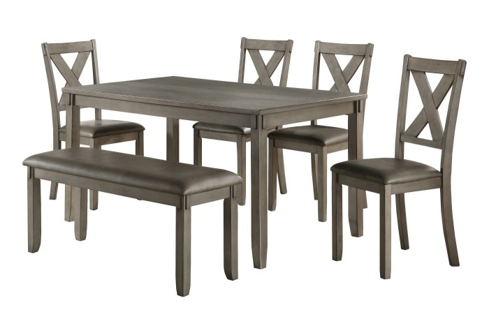 Designed in the transitional style for your casual dining space, the Holders Collection will be a welcome space for your friends and family to gather during meals and social activities. The convenient 6-piece packaging of the collection includes a table, four chairs and a bench. X-back, wood frame chairs perfectly complement the understated design of the table. Light, neutral tone seats create complementing contrast to the gray finish of the collection.