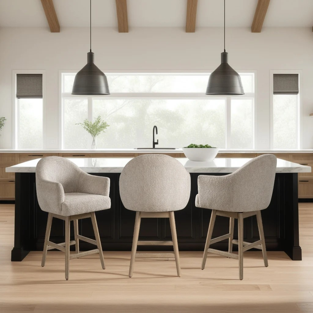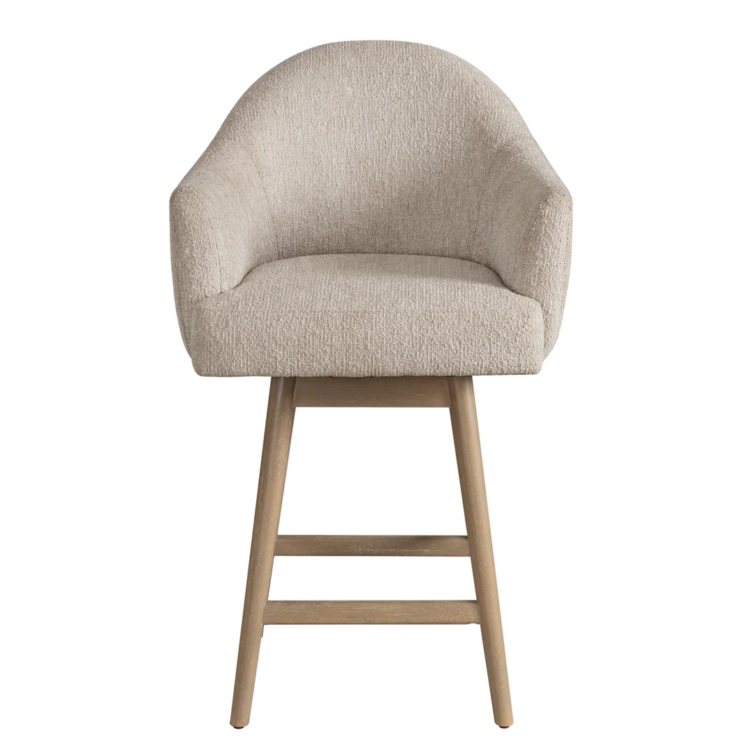 The Jaxon Barstool combines elegant modern transitional design with everyday practicality, making it the perfect choice for your kitchen island, bar, or counter. With its soft curves, low-back upholstered seat, and built-in armrests, the Jaxon Barstool offers both comfort and sophistication. Upholstered in durable polyester fabric, the fiber-wrapped foam cushioning ensures a plush and cozy seating experience, ideal for casual meals or entertaining guests. Available in two versatile heights, 26-inch counter height and 30-inch bar height, the Jaxon Barstool caters to a variety of settings. Its sturdy rubberwood frame, finished with a brushed technique, highlights the natural beauty of the wood while ensuring long-lasting durability. The 360-degree swivel feature adds ease of movement, making it perfect for lively conversations and convenient access. Choose from timeless finishes like Brown Oak with Morning Fog Upholstery or Washed Wood with Ancient Stone Upholstery, both designed to complement a range of interior styles. Equipped with plastic glides to protect your floors, the Jaxon Barstool is as functional as it is stylish. Assembly is simple and takes approximately 30 minutes with just a screwdriver and two people for a quick and hassle-free setup.