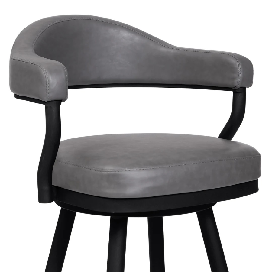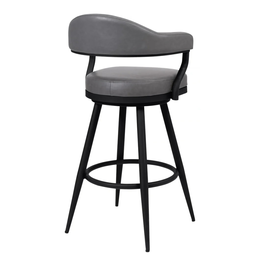 Enhance the bar seating experience for you and your guests with the Justin 26" Counter Height Swivel Vintage Gray Faux Leather Bar Stool with Black Metal Legs from Armen Living. The strong frame is constructed from metal and its cool appeal is further accented by the soft faux leather upholstery. The open back allows for easy breathable seating and makes cleanup a breeze. Engaging with your guests has never been easier thanks to the 360-degree swivel function that adds convenience with its optimal mobility. Pull the Justin counter stool up to your kitchen island, peninsula counter, or home bar and enjoy its durability and aesthetic for many years to come. The Justin’s rounded back features ergonomic properties to keep your back healthy and properly aligned. The legs are equipped with floor protectors that will prevent any scratches or damages to your floors while moving the stool. Available in 26” or 30” seat heights, the Justin is available in a black finish with grey, black, or vintage coffee faux leather upholstery, a brushed stainless-steel finish with black, or grey faux leather upholstery, or a brown finish with vintage brown faux leather.