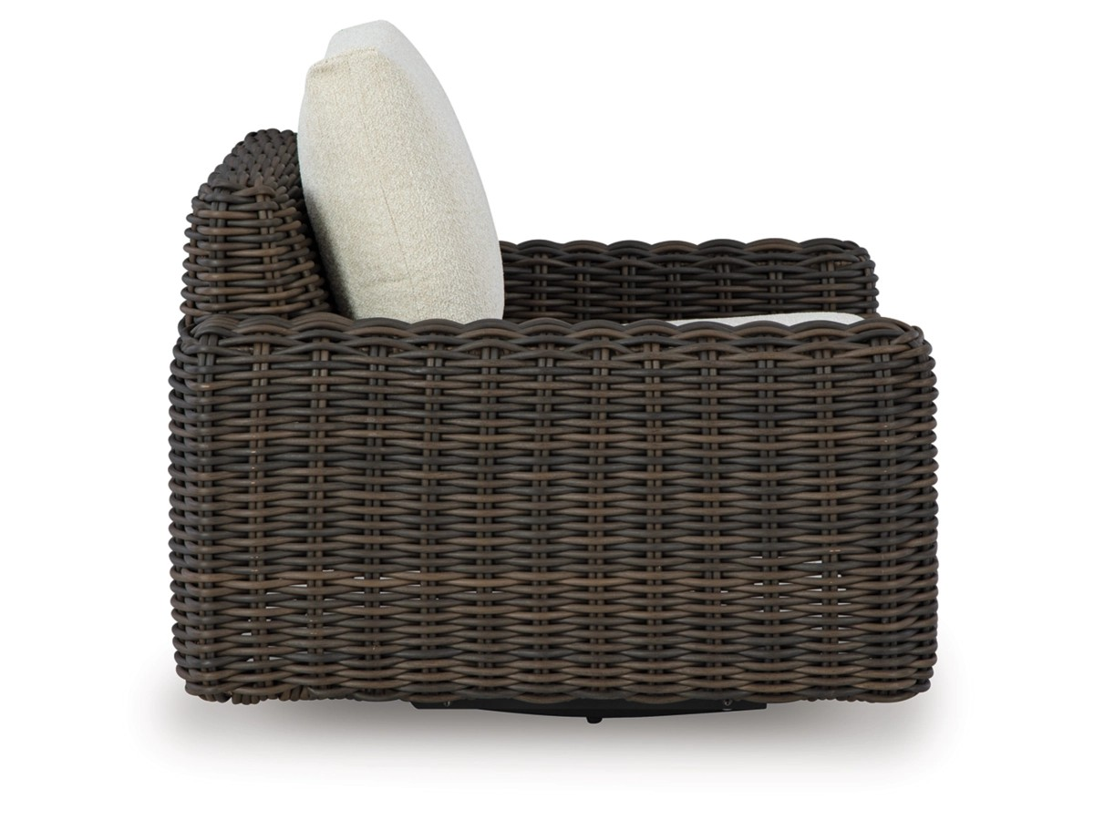 Add luxury, comfort and durability to alfresco fun. The Kimora outdoor swivel glider lounge chair captures the textural beauty of wicker while withstanding the elements, from rain to shine. With a UV-resistant design, the wonderfully low-maintenance Nuvella+™ fabric maintains its good looks over time. Deep, roomy seating completes the piece, offering ample space to sprawl out.