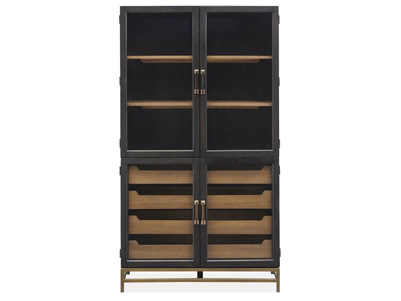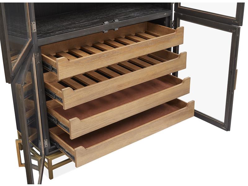 - 2 wine storage drawers and 2 felt lined drawers behind the 2 bottom wood framed tempered glass doors.