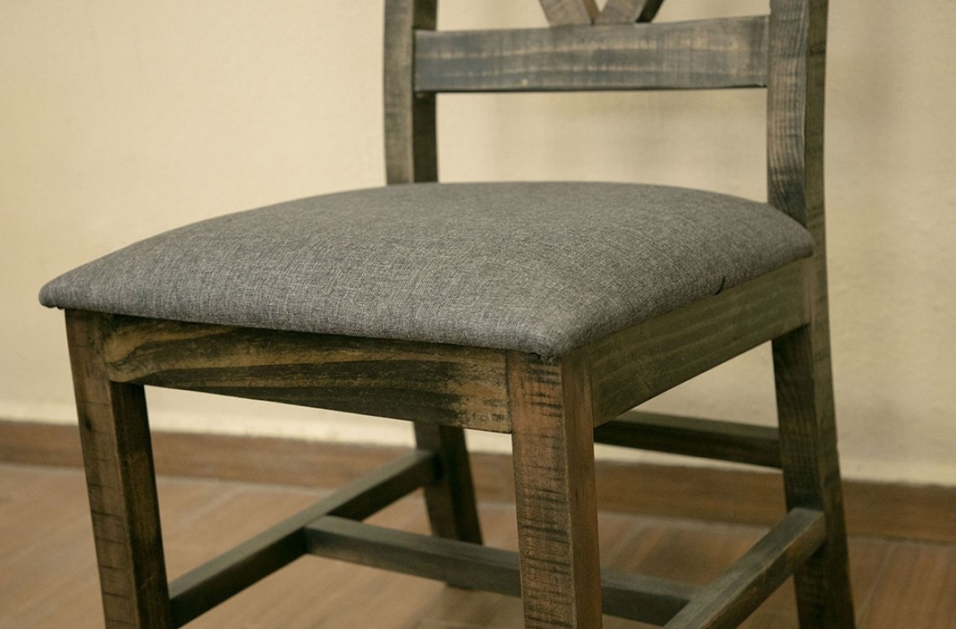 - Upholstered seat features 100% polyester fabric with a linen-feel texture in gray.