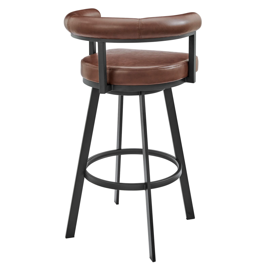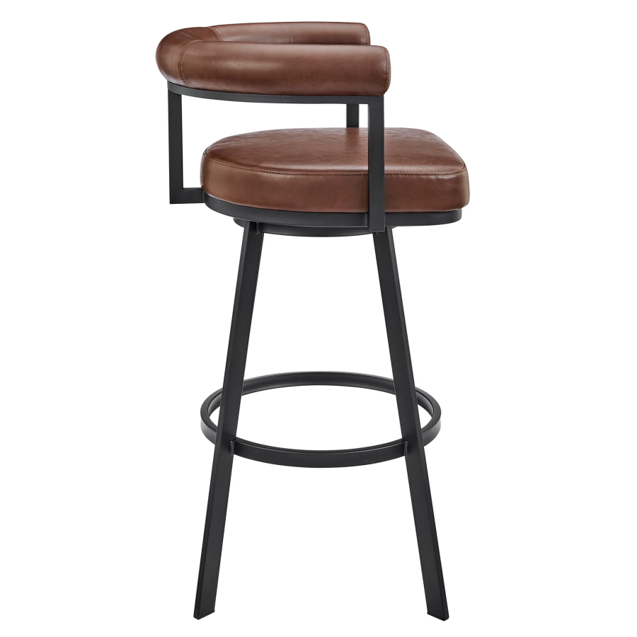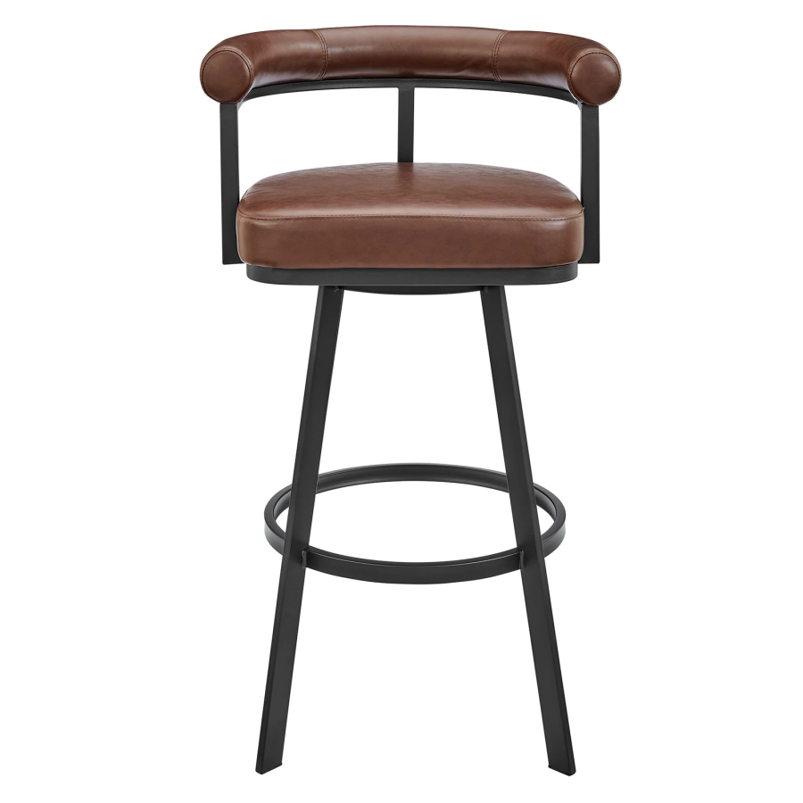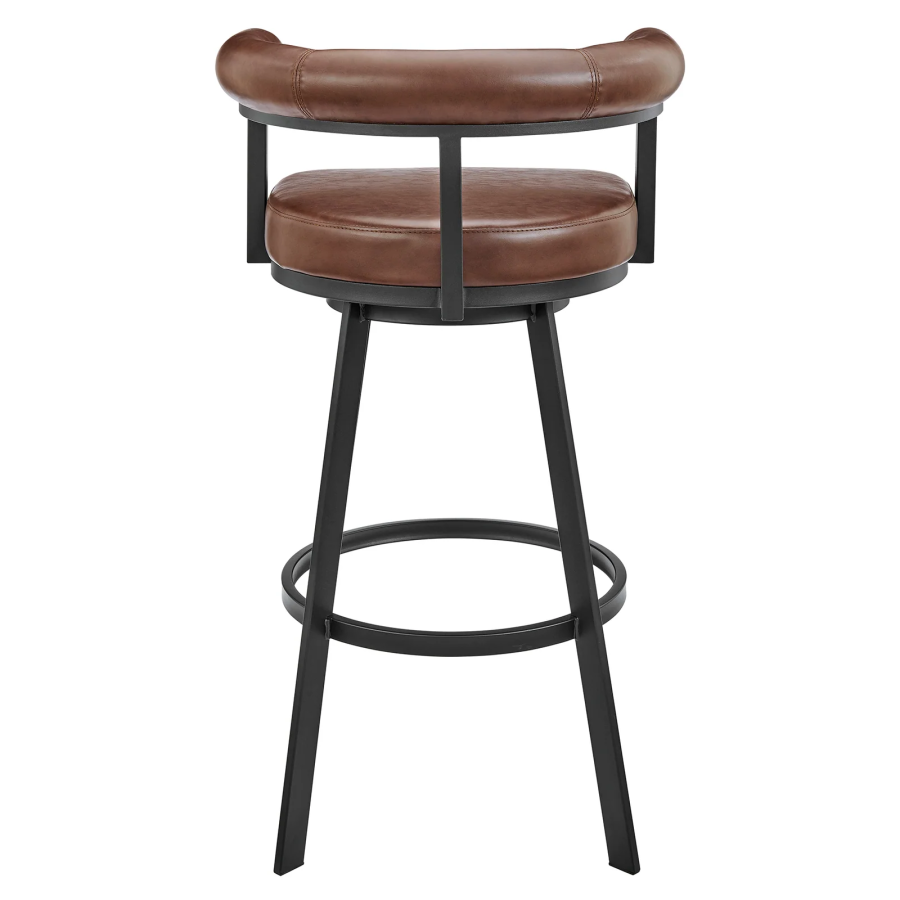 Elevate your space with the flair of our Magnolia swivel chair, bar stool or counter height stool in faux leather and metal from Armen Living. Featuring a minimal and streamlined barrel back, this mid-century modern counter stool exudes a sleek and inviting look. Plush cushioning at the back and the padded seat provide a comfortable seating experience, while the open back design allows for breathability. Elevated by a chic metal frame, our stylish counter stool or barstool makes a powerful design statement. Upholstered in faux leather, it ensures a comfortable experience at high dining areas, kitchen counters, or worktables. Faux leather's durability ensures it won't easily crack, stain, fade, or be affected by UV exposure. Counter or bar-height stools with a swivel mechanism offer added convenience for daily use and entertaining. The full 360-degree swivel chair function provides maximum mobility, and the smooth glide swivel allows you to change directions effortlessly, making it your new favorite seat at home. The Magnolia faux leather and metal kitchen barstool is available in a black finish with brown or gray faux leather, a brushed stainless-steel finish with your choice of black, light gray, or white faux leather, or a java brown finish with chocolate faux leather upholstery. This barstool is available in both 26-inch seat height and 30-inch seat height options.