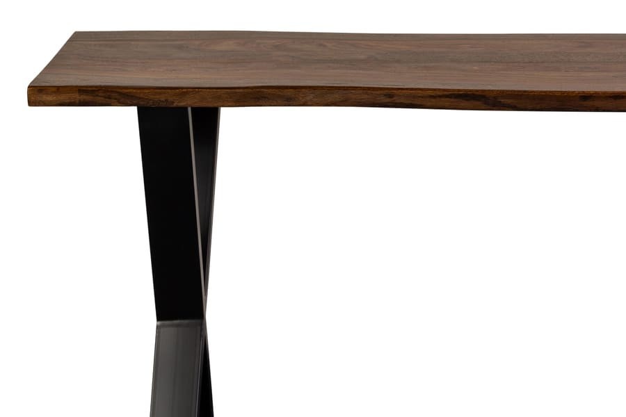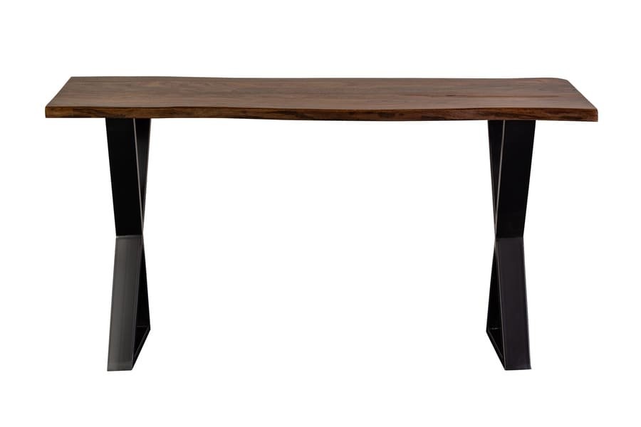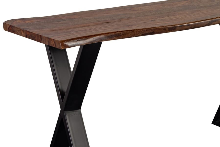 Made from sustainably sourced sheesham wood, the variation in grain, color and texture makes each piece one of a kind. Architectural metal bases can be mixed and matched for personal customization. Handcrafted by artisans to create a live edge finish, this beautiful solid wood collection features heirloom quality furniture built to last a lifetime. A rich, honey-toned Harvest finish accentuates the beautiful grain variation.