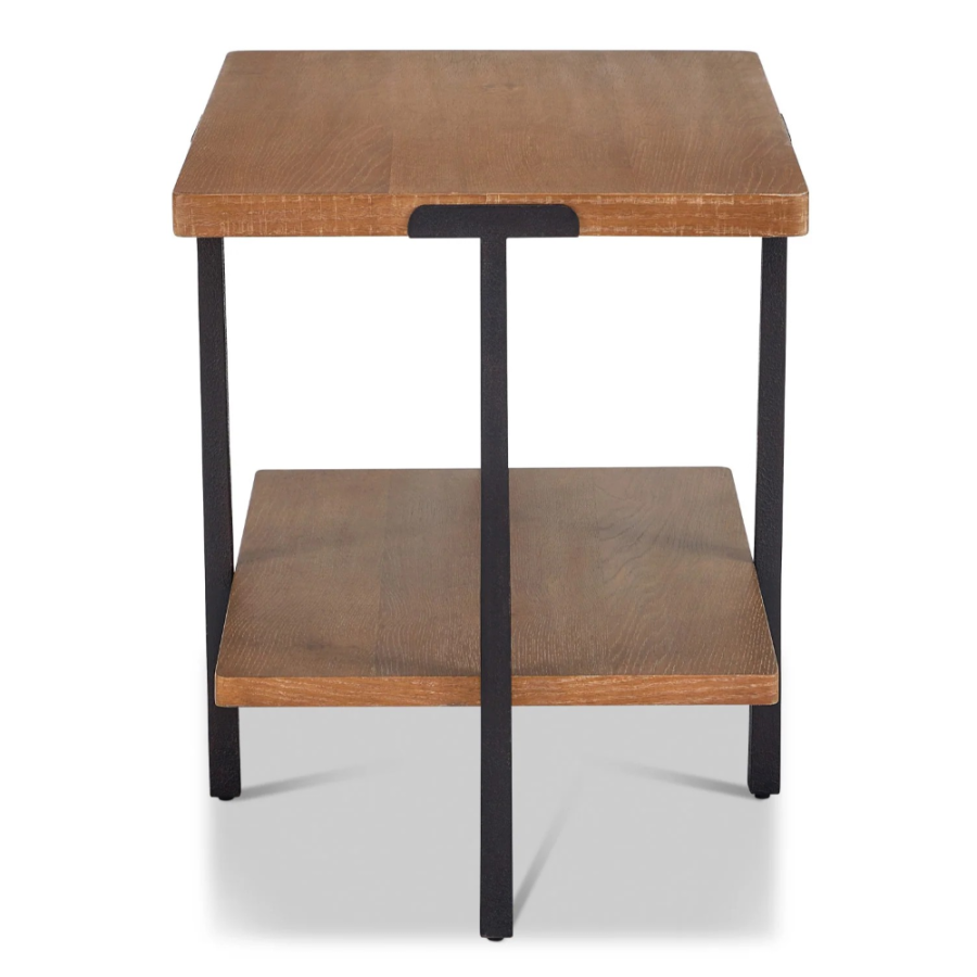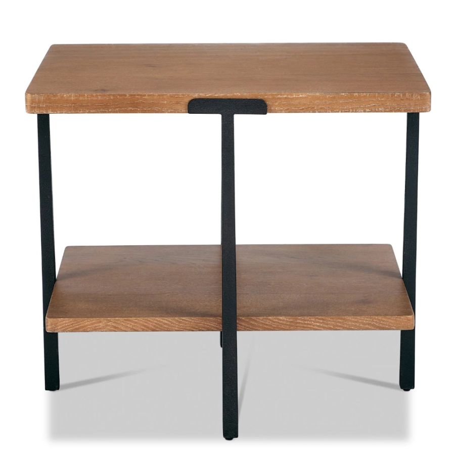 Sophistication meets rustic, industrial charm with the Millwork rectangular end table. Seamlessly blending high-contrast materials and finishes in perfect harmony, this table makes a captivating statement in any living space. A textured steel frame is highlighted by warm copper undertones, while a distinctive wood top and lower shelf exude character with natural knots, subtle saw marks and a white cerused finish that accentuates the rich umber wood grain.
