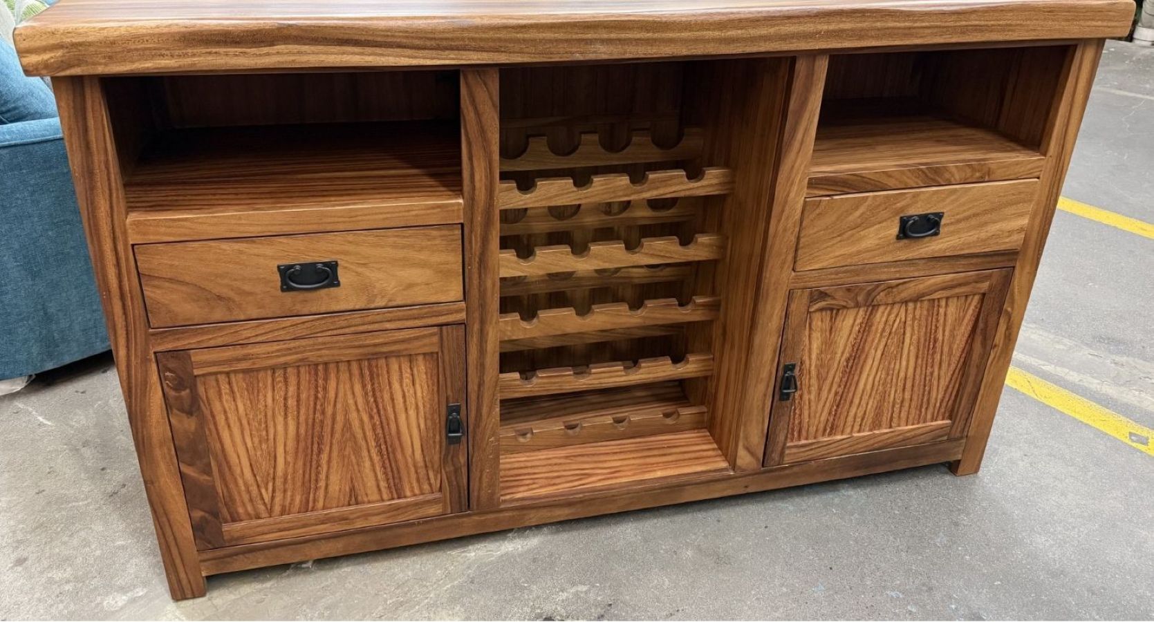 Elevate your entertaining space with this stunning Nairobi Bar. Crafted from rich, warm-toned wood, the natural grain and live-edge style countertop add an authentic, rustic-meets-modern feel to any room.