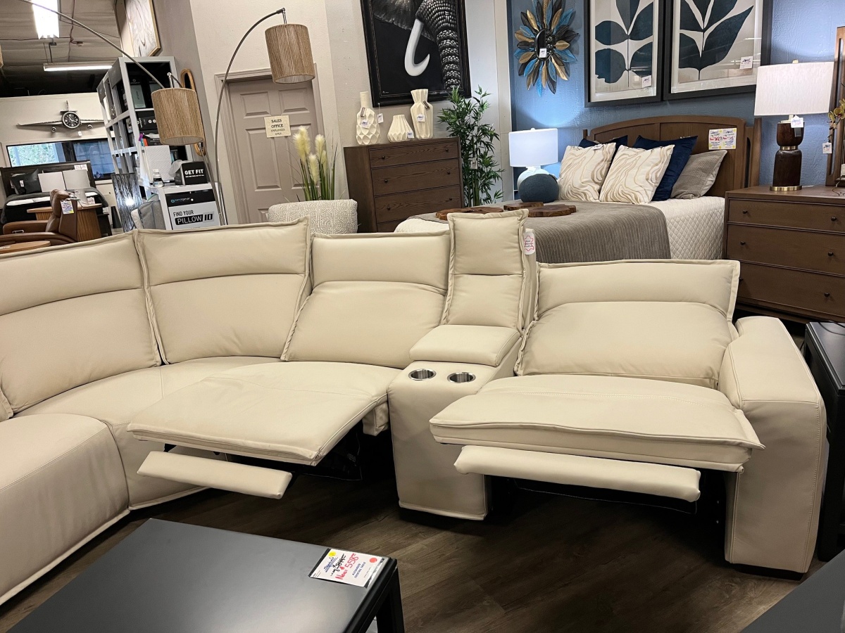 The Futura Premium Leather 6-Piece Reclining Sectional is a contemporary, full-sized seating arrangement designed for comfort, functionality, and a clean modern look. It is upholstered in premium top-grain leather on the seating surfaces, giving it a smooth, soft feel along with durability for everyday use. The light neutral color shown in the image adds to its upscale appearance and allows it to blend easily with a wide range of interior styles.