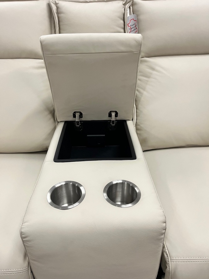 Console with two silver stainless steel cupholders, lift top storage, and hidden power station with 1 USB port and 1 USB-C port