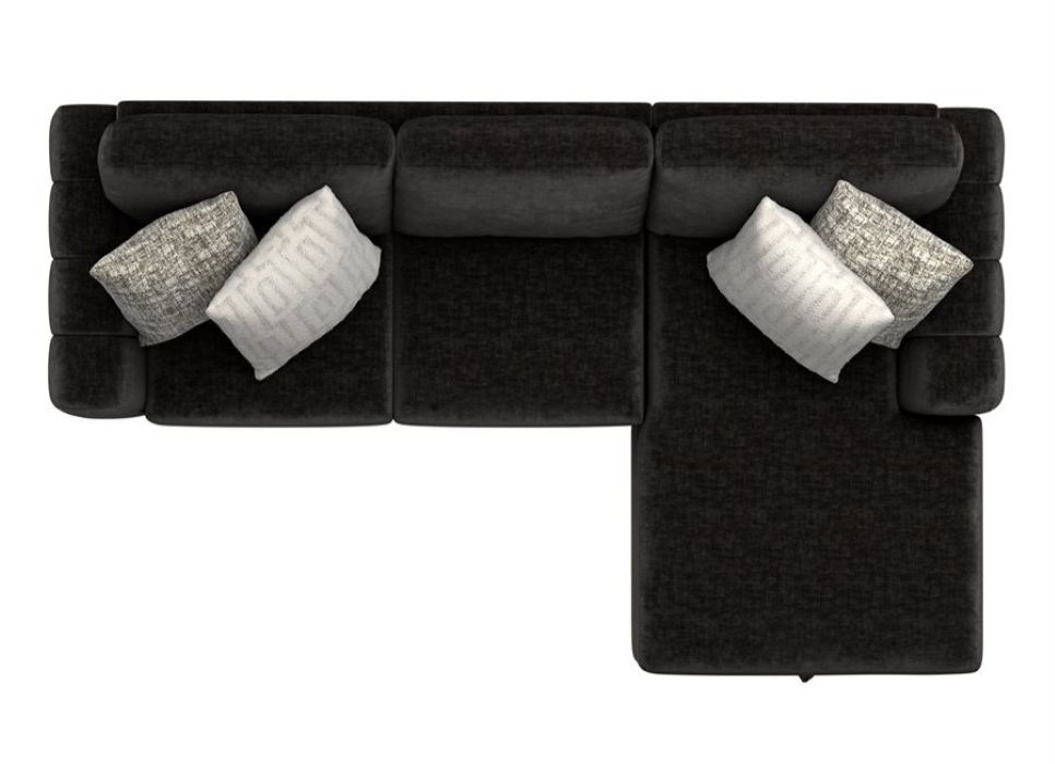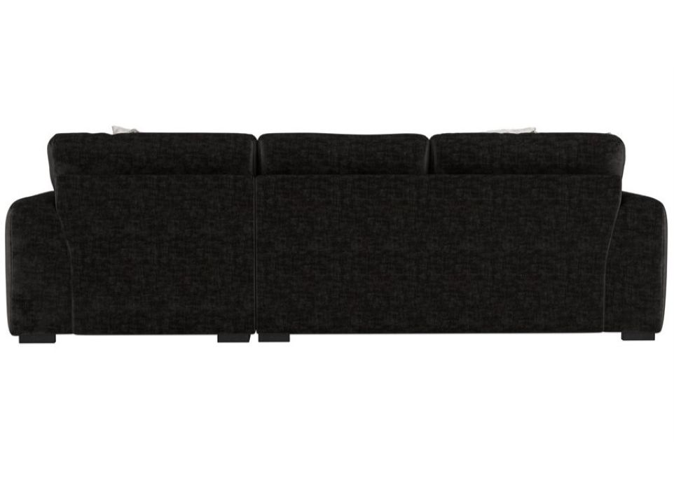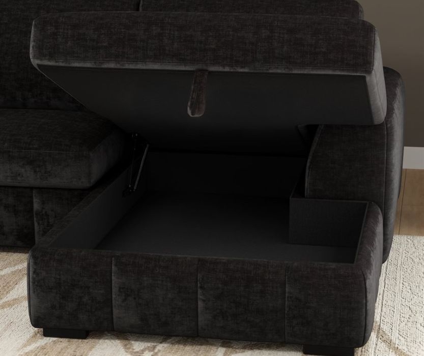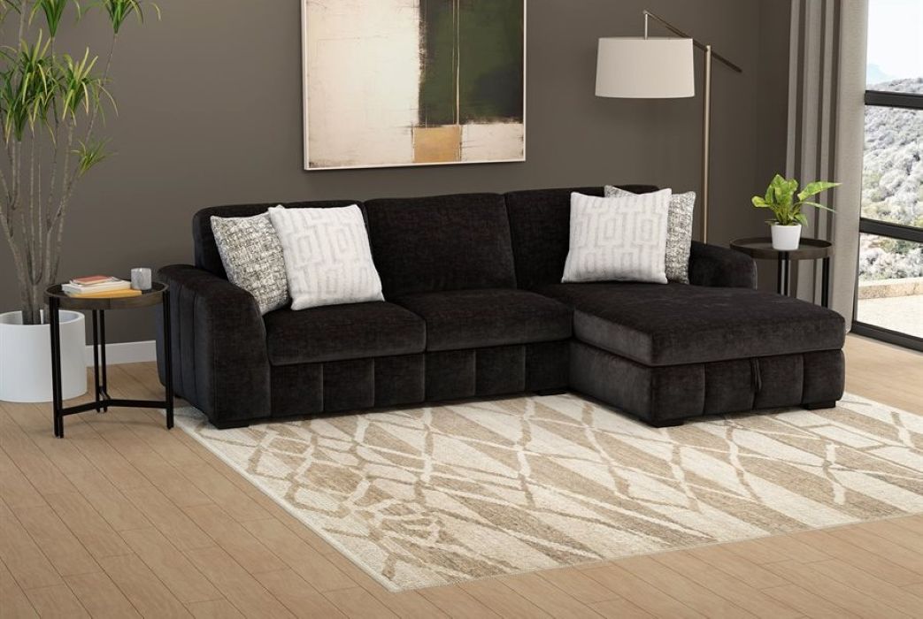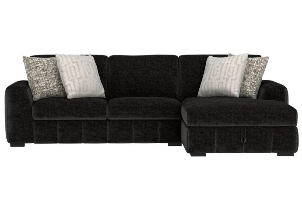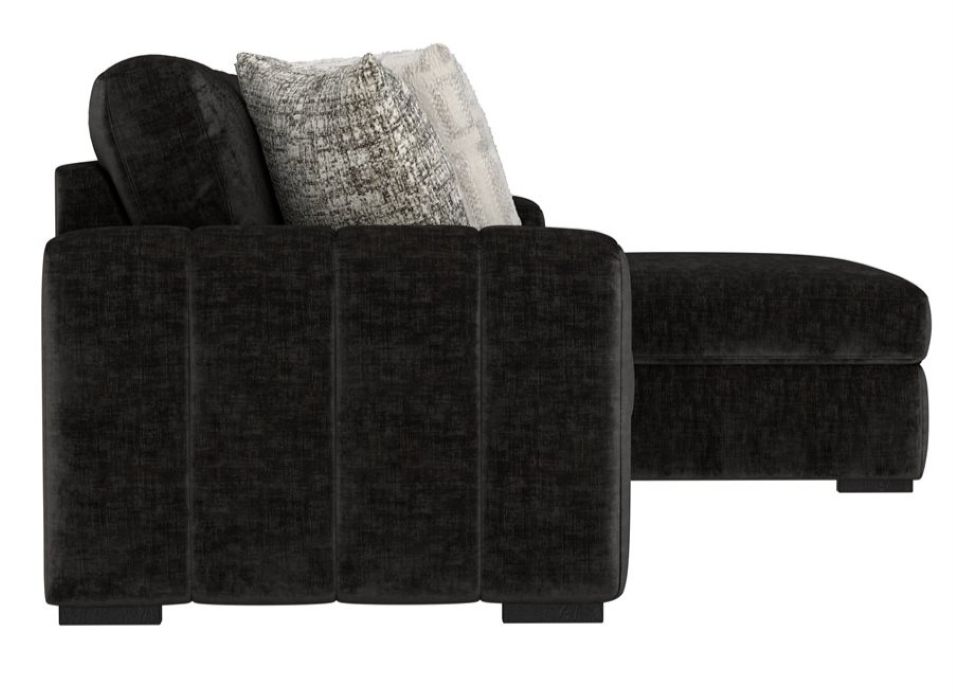 The Ritchie Collection invites you to sit but beckons you to stay. Wrapped in obsidian black fabric, its soft texture and deep tone anchor the room with contemporary confidence. Fixed cushions cradle you in comfort, while the spacious chaise is made for lounging and lazy afternoons. Hidden storage in the chaise keeps essentials neatly tucked away. Four coordinating throw pillows, two in a tufted chenille pattern on a soft ivory woven ground and two in a black and taupe motif over an ivory base, add texture, contrast, and layered visual warmth. Built for both style and everyday ease, this sectional delivers lasting comfort and modern appeal that makes staying in your new favorite plan.