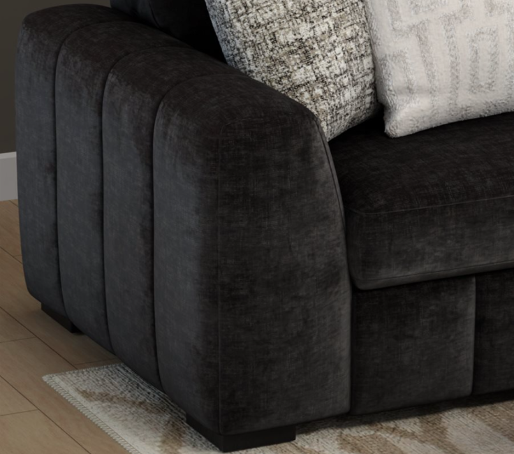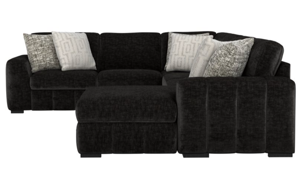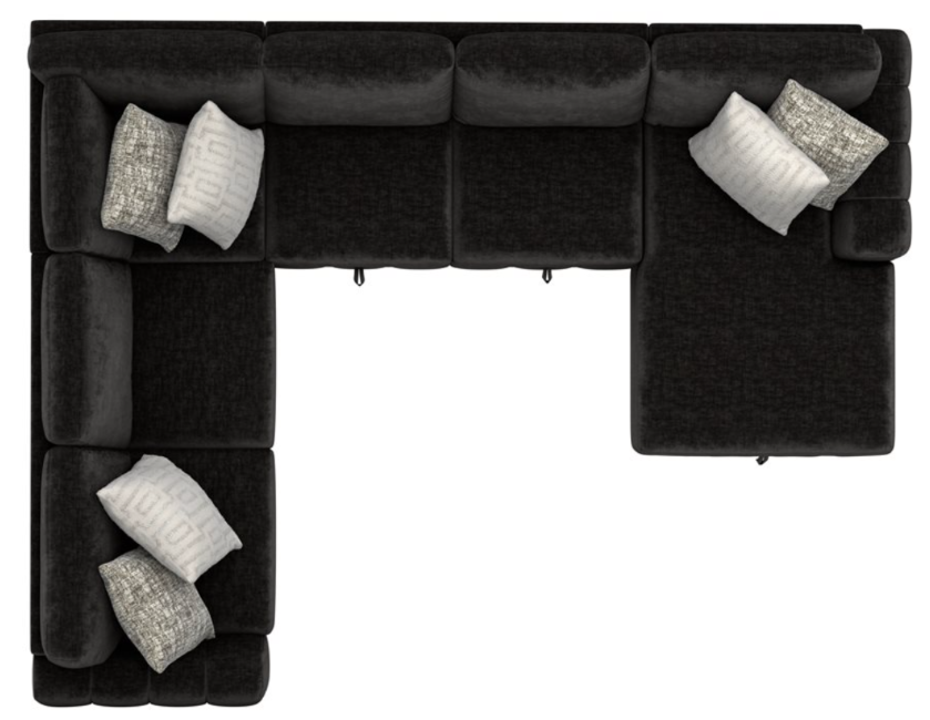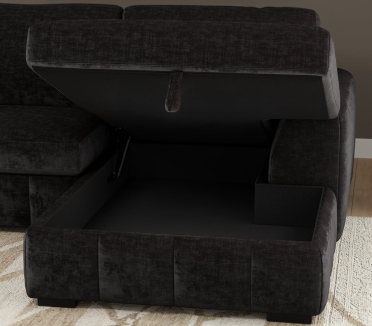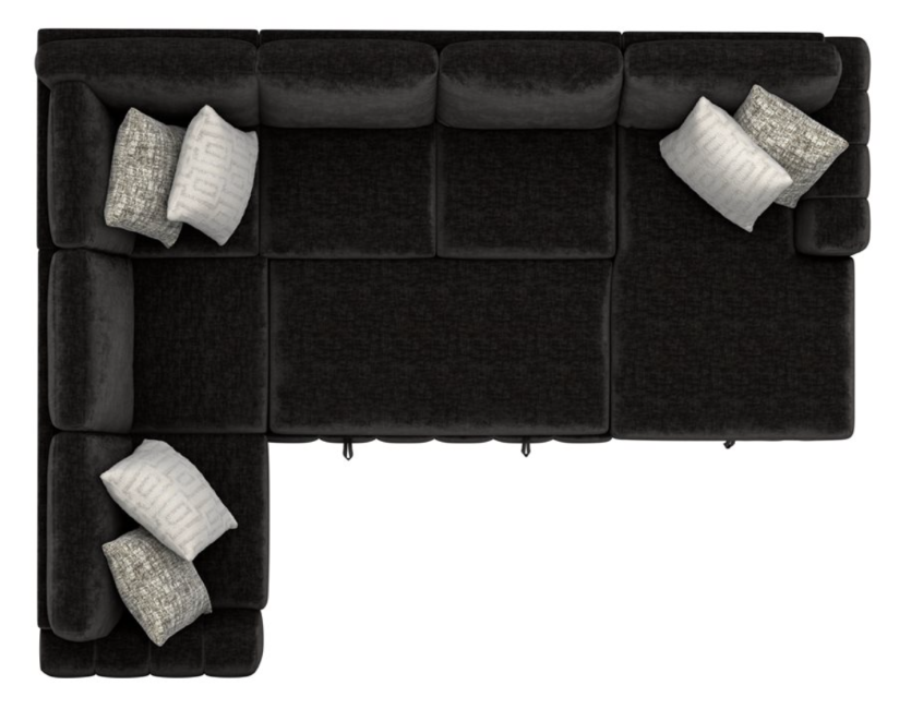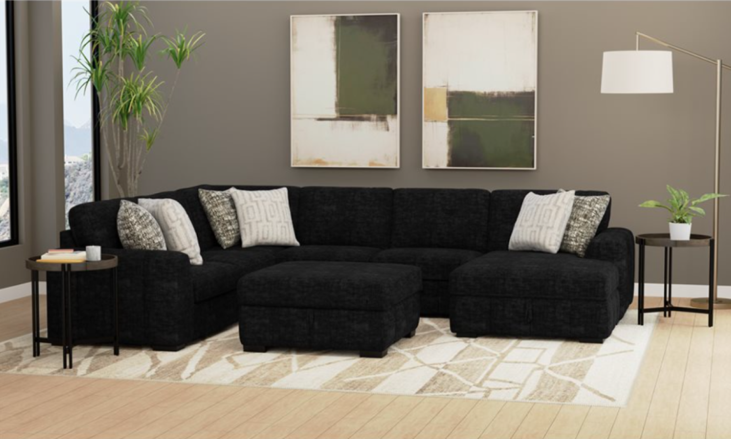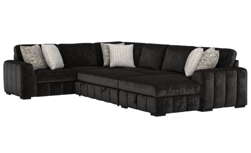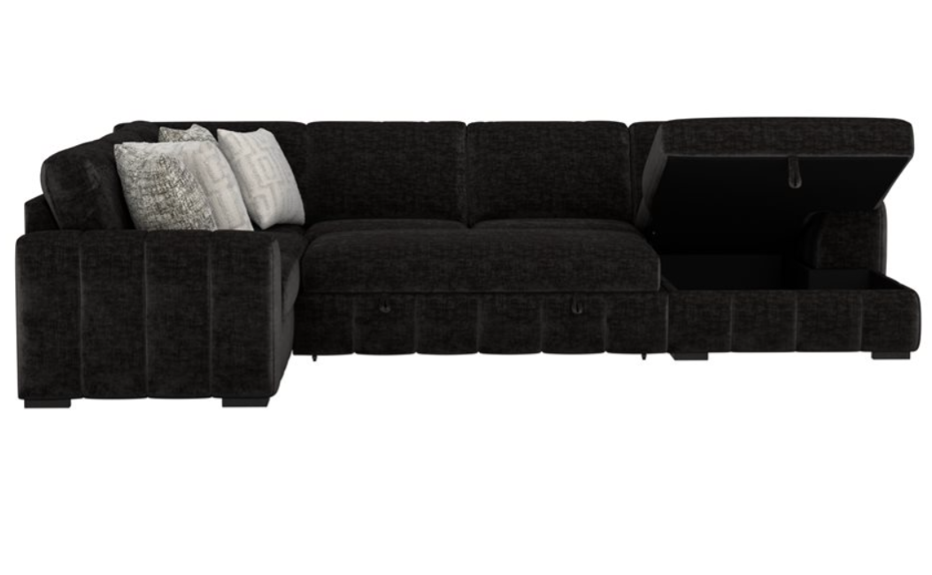 The Ritchie Collection invites you to sit but beckons you to stay. Wrapped in obsidian black fabric, its soft texture and deep tone anchor the room with contemporary confidence. Fixed cushions cradle you in comfort, while the spacious chaise is made for lounging and lazy afternoons. A pop-up sleeper extends the versatility for overnight guests, and hidden storage in the chaise keeps essentials neatly tucked away. Six coordinating throw pillows, three in a tufted chenille pattern on a soft ivory woven ground and three in a black and taupe motif over an ivory base, add texture, contrast, and layered visual warmth. Built for both style and everyday ease, this sectional delivers lasting comfort and modern appeal that makes staying in your new favorite plan.