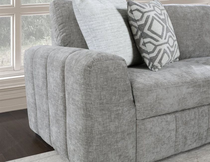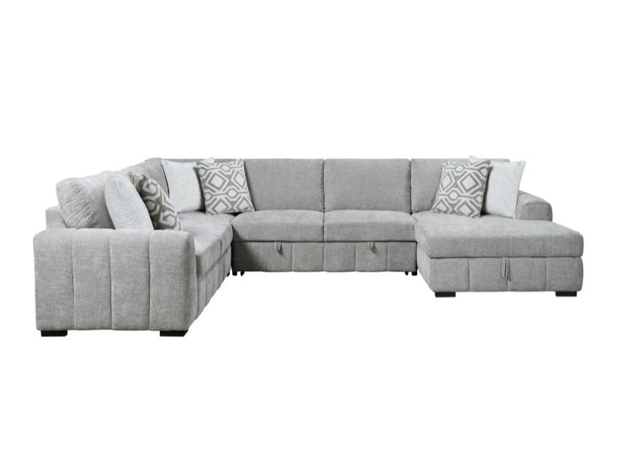 The Ritchie Collection invites you to sit but beckons you to stay. As you settle in, you'll notice all the contemporary details—fixed cushions that cradle you, a spacious chaise that begs for lazy afternoons, and a pop-up sleeper for those impromptu guest visits. The sectional is upholstered in a soft, light gray fabric, with vertical channel tufting on the sides, and front, while the brown and creamy white patterned and faux fur throw pillows add depth and warmth. With hidden storage in the chaise, everything you need is always within reach.
