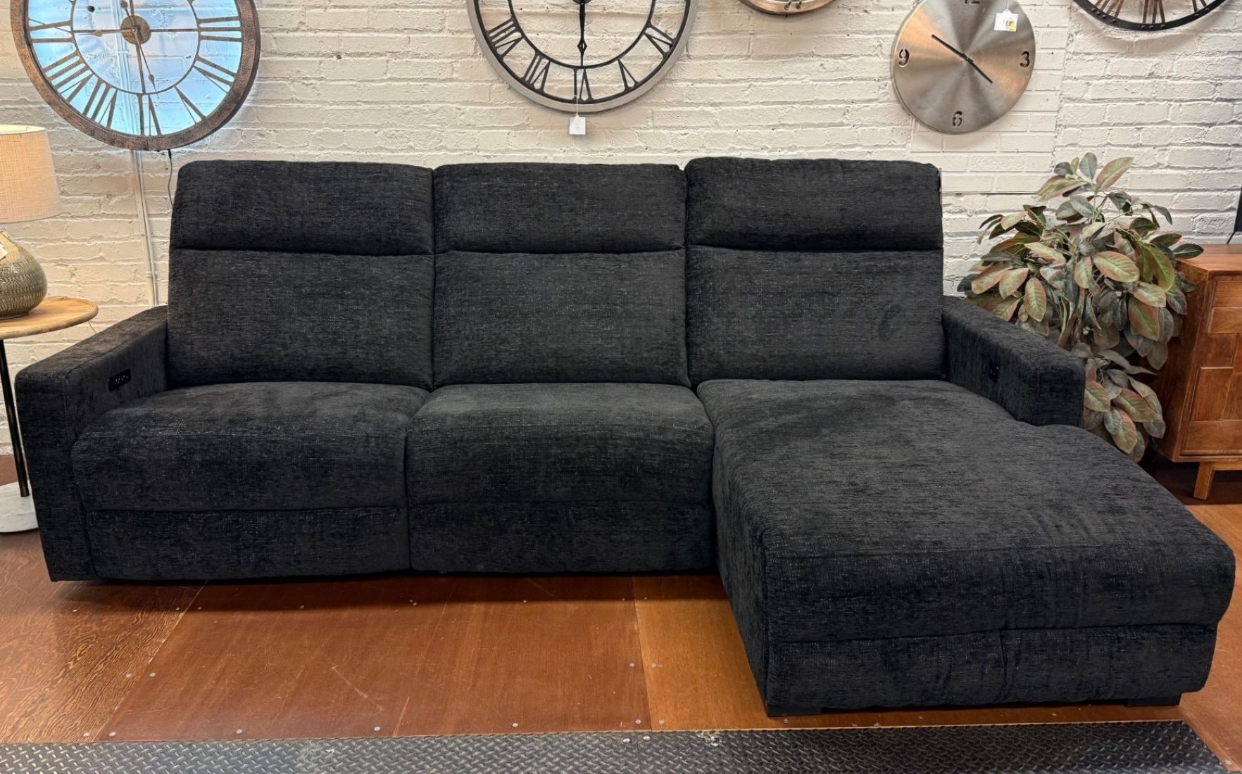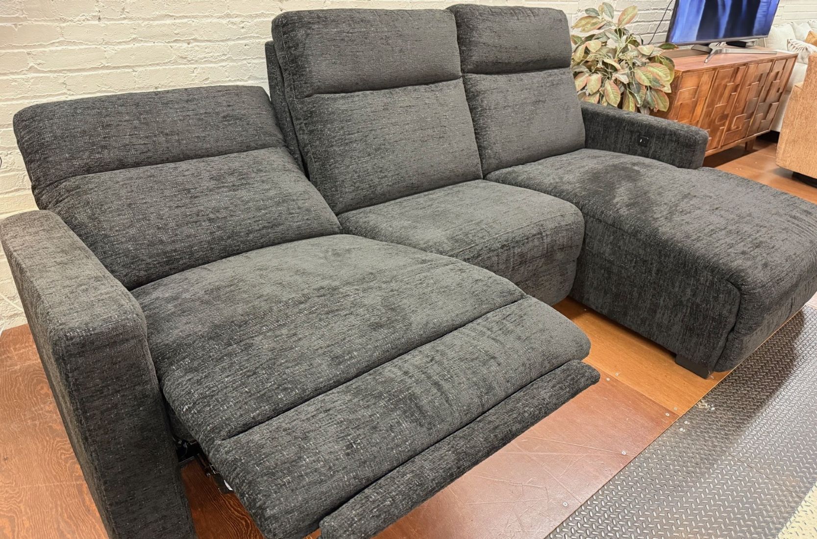 Elevate your living space with the Sahara Ebony 3Pc Modular Sectional, designed with comfortability and functionality in mind. Wrapped in soft, Sahara Ebony fabric, this sectional brings comfort and style to your living room. This sectional features a power reclining seat and power headrest that can be adjusted with the touch of a button. A convenient “HOME” button can be pressed for easy access to return to the upright position. The inclusion of USB ports allows you to keep your devices charged and within reach while seated. The center seat back folds down to reveal a wireless charger and USB port, as well as cupholders and 2 touch-control lights. Transform your home with this modern and functional sectional.