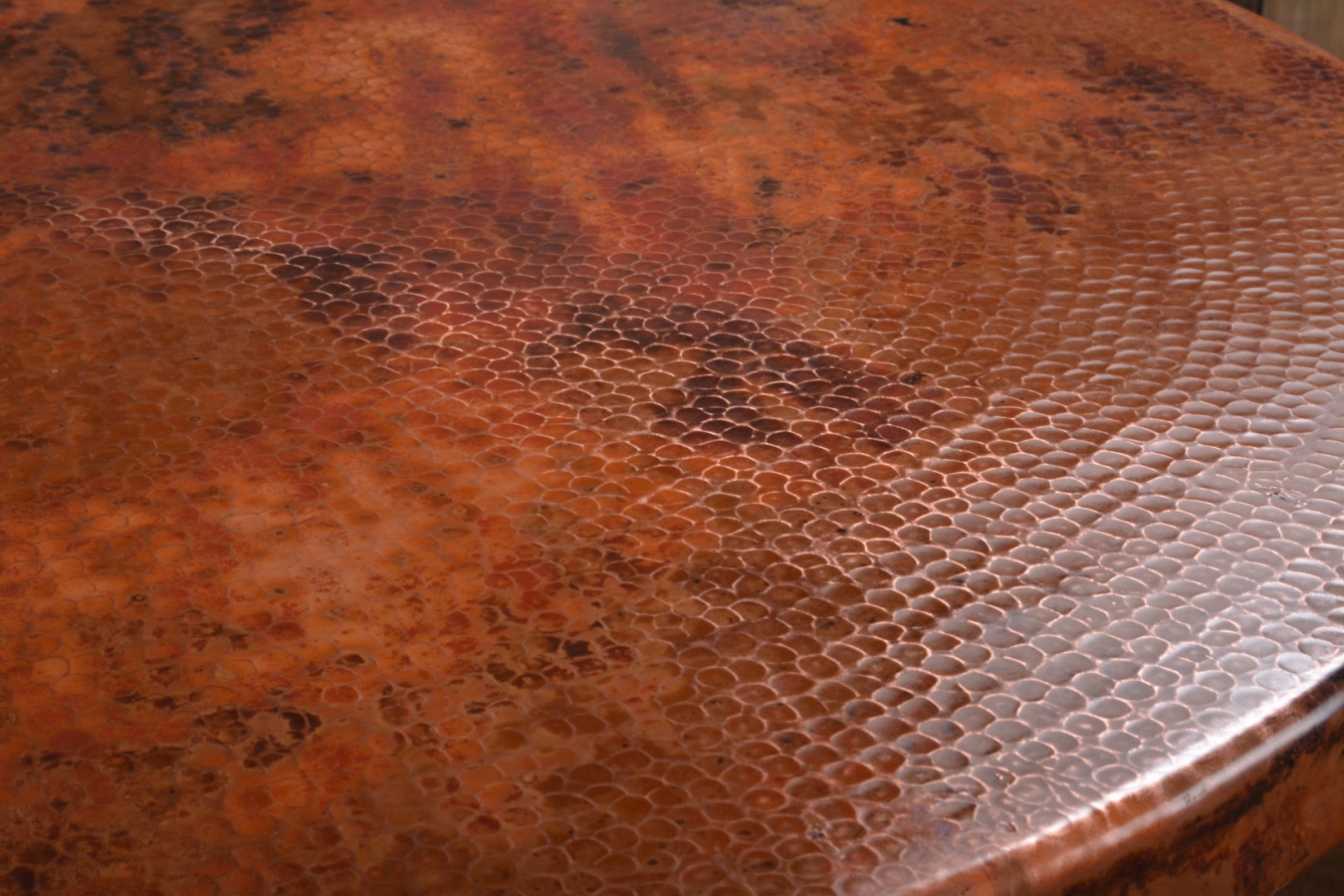 This copper top is made from 100% reclaimed copper. Each top is individually hand hammered using technique handed down for generations. Each piece is burned over an open fire to bring out character and unique tonality. Each top will have its own unique characteristics and range of color. Every top will be different. Dark burned marks are naturally occurring and not a defect.