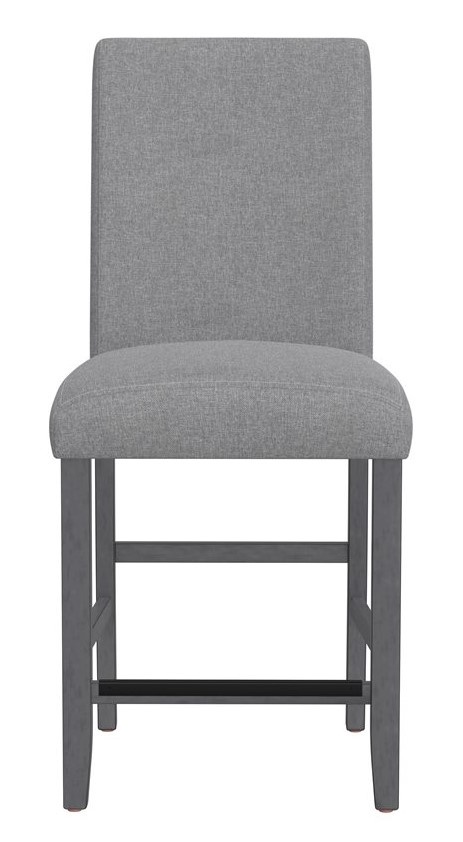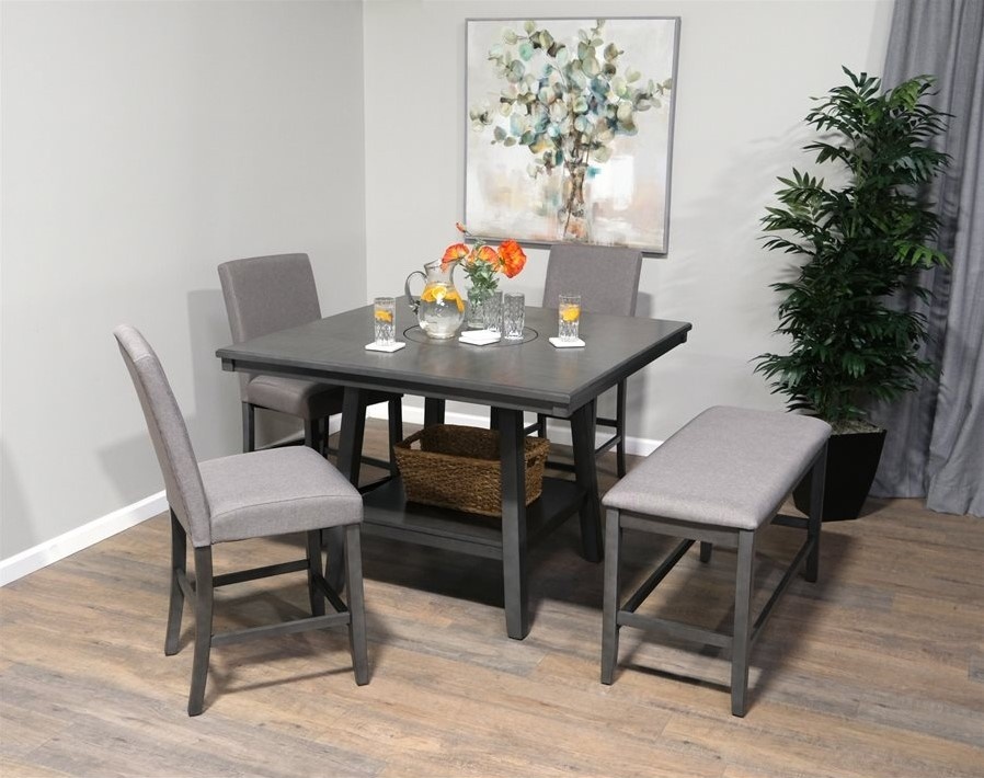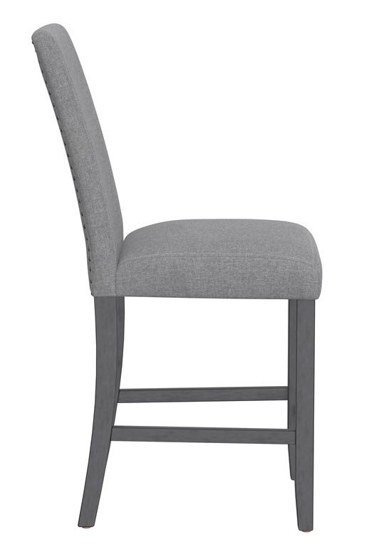 The transitional Seneca collection hosts a unique blend of features and seating options. A delightful medium gray finish on walnut veneers forms a quarter-turned pattern on the tabletop, culminating in the built-in 18” lazy Susan. The tapered frame spreads out to encompass a lower shelf for extra storage. Seating with light gray upholstery and gently curved backs decorated with nailhead trim, you can stay more traditional with just stools or more casual by mixing in a bench or two. Accentuate your personal style and give the Seneca a whirl.