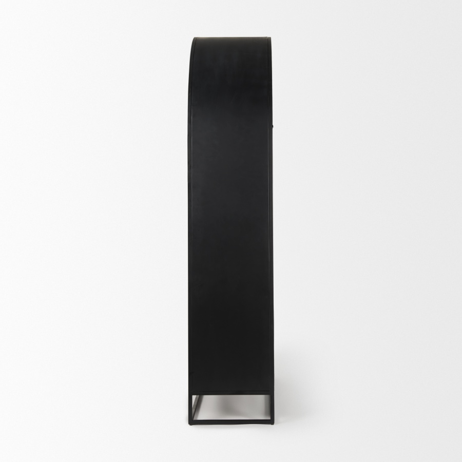 The Sloan Cabinet is a masterpiece of design with its clever use of materials and lofty aesthetic. This granddame features an arched cabinet that sits atop a modern iron base. The cabinet itself is made from a sturdy black iron, and is fronted by dark, solid mango wood doors. The doors feature a sleek iron grip and tempered glass that provide a window into the lighter solid wood interior. Once opened, the cabinet reveals a beautiful light brown inner, and removable shelves to show off much-loved curated pieces.