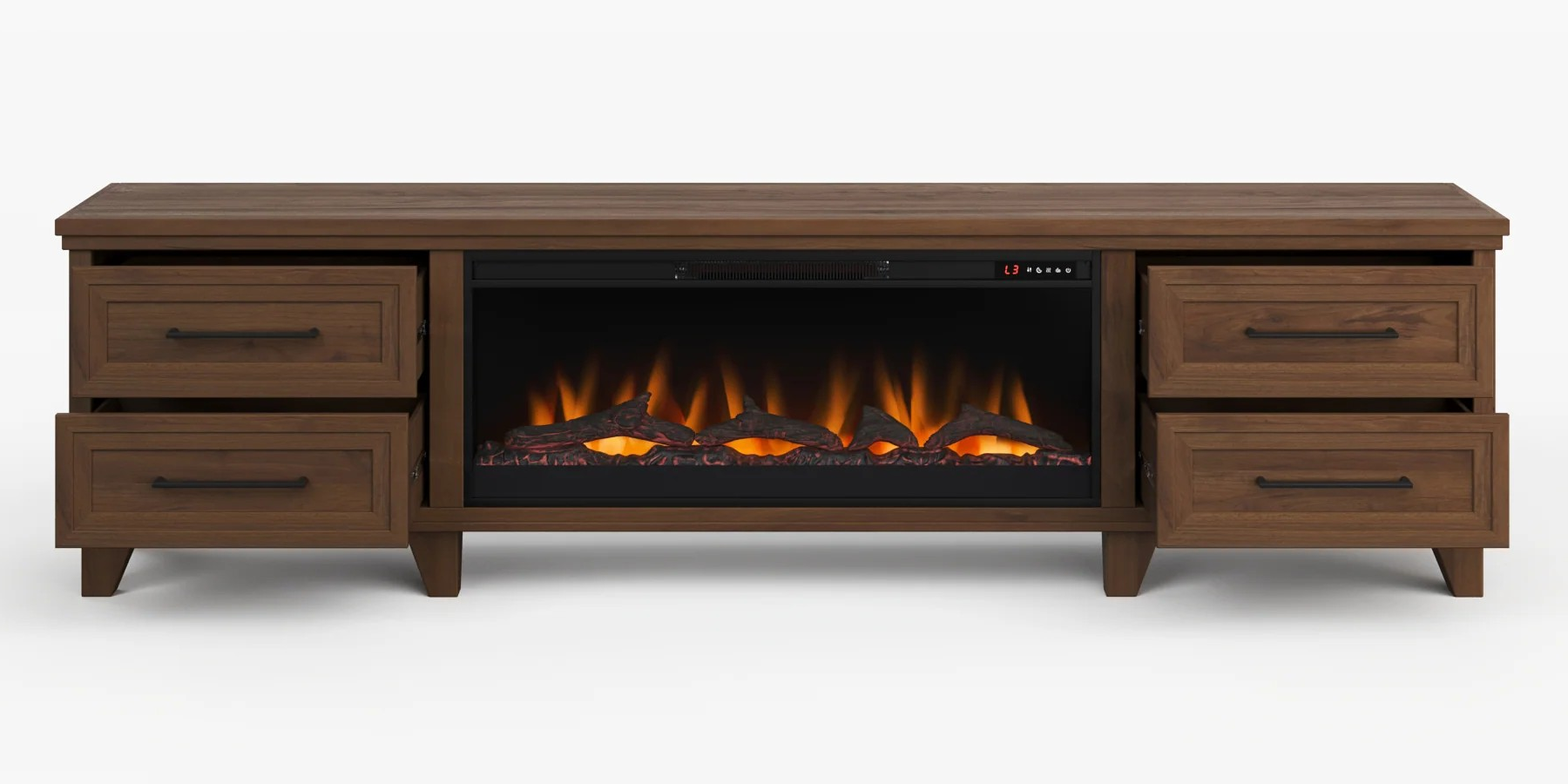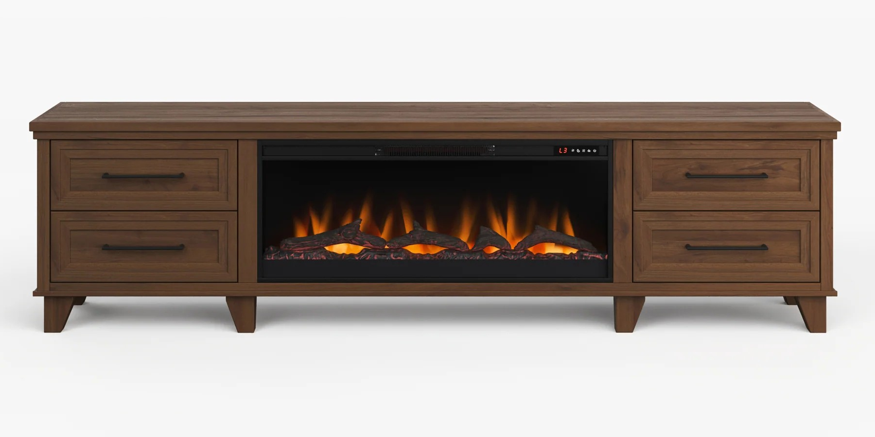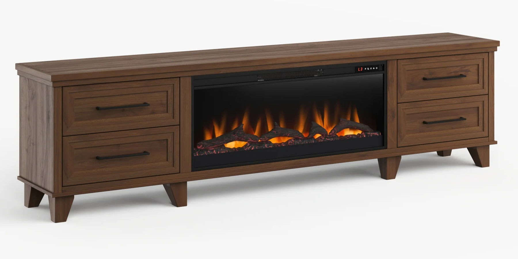 The Sonoma 95" Fireplace Console brings a blend of modern style and cozy functionality to your living space. Perfectly designed to fit TVs up to 105", this console features a 42" fireplace insert with a convenient remote control, providing both warmth with its infrared heater and a cozy aesthetic through its gentle flame effect. With four extra-wide drawers, you’ll have plenty of space to store electronics, media, or household items, while the minimalist satin black tubular door pulls add a sleek touch. This fireplace console blends style and functionality, making it a great addition to your living area.