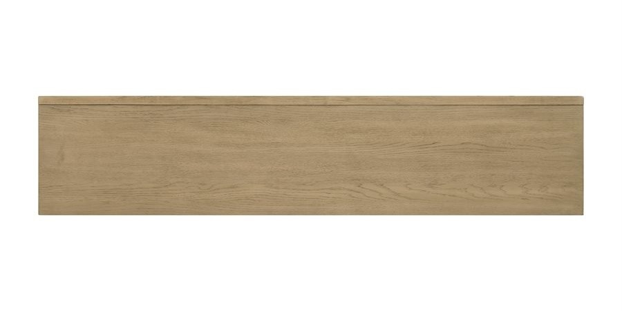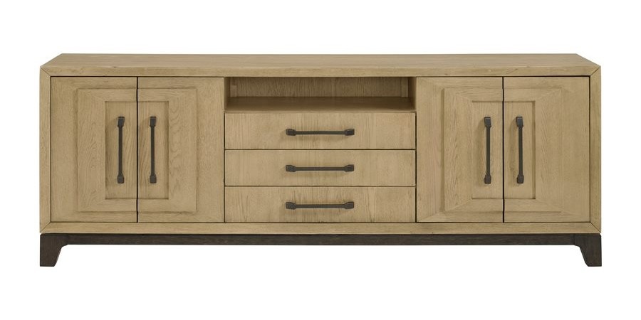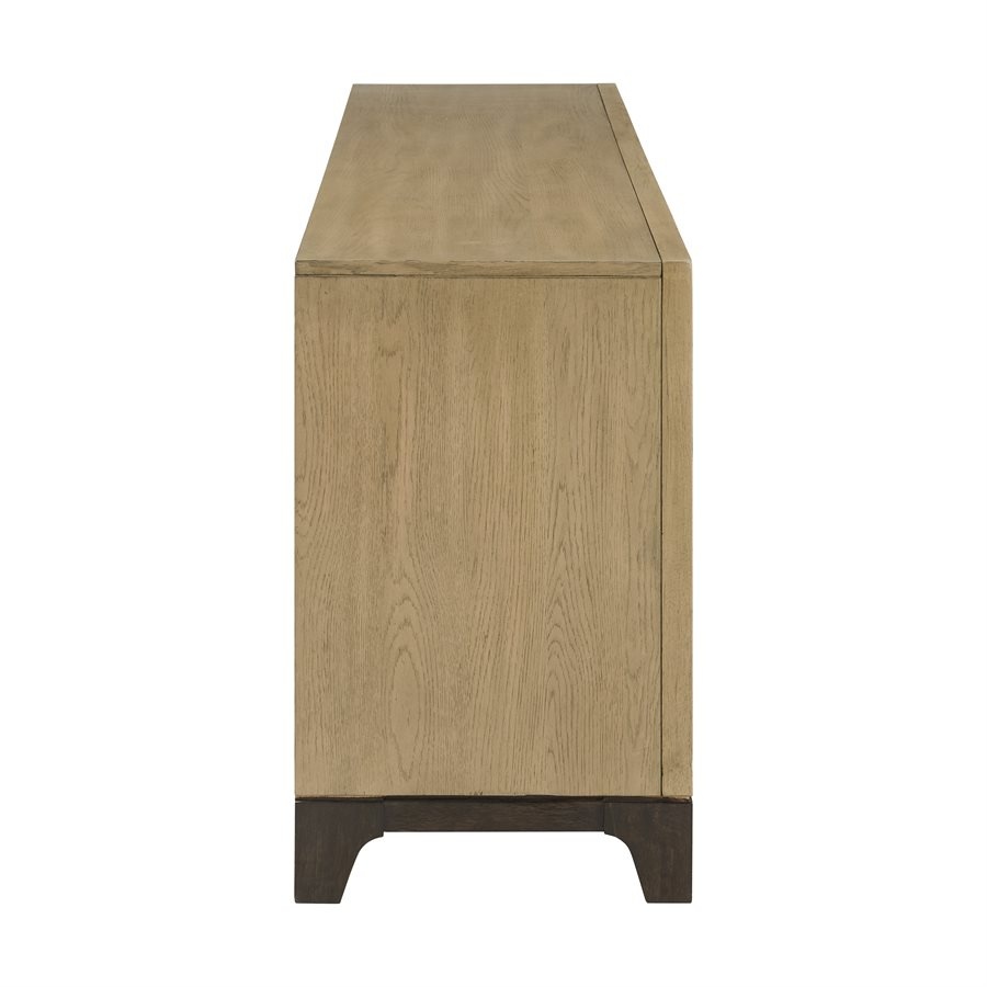 The Sutton Place entertainment collection embodies relaxed contemporary style with a focus on the natural beauty of oak. Crafted with tight-grain, book-matched oak veneers framed by a contrasting straight grain border, the console top showcases a warm caramel tone atop a cocoa base. Dark bronze bar pulls add subtle contrast to the console creating a sophisticated yet inviting living space.