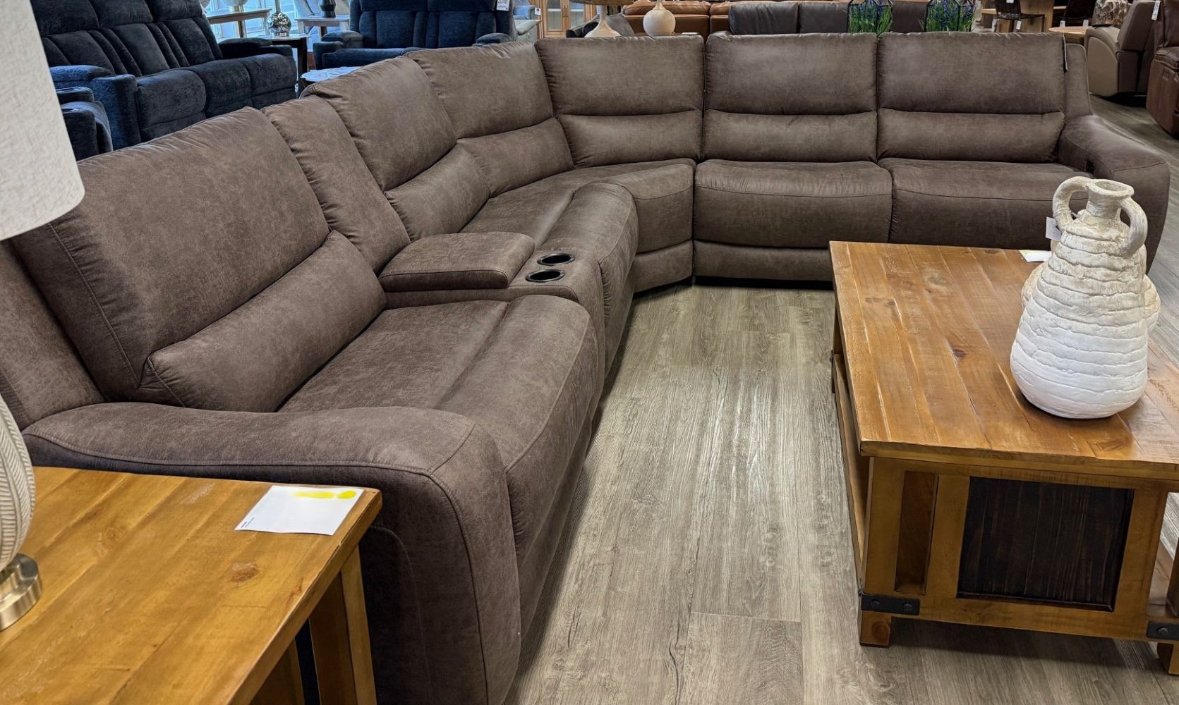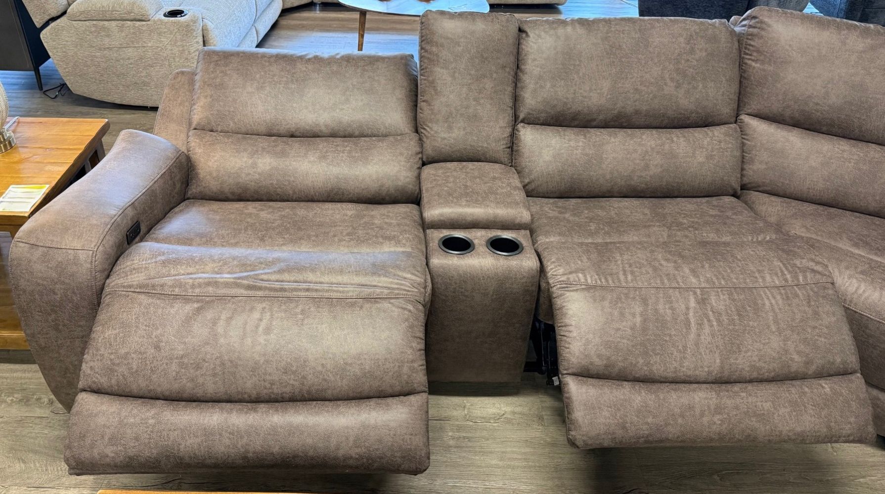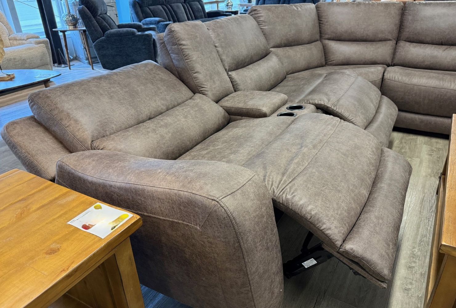 Designed for spacious comfort and modern functionality, this modular set combines the sleek, sophisticated look of leather with the velvety softness of high-performance microfiber. Finished in a warm Texas Slate, this fabric is engineered for durability and stain resistance, making it an ideal choice for busy family rooms.