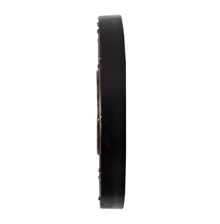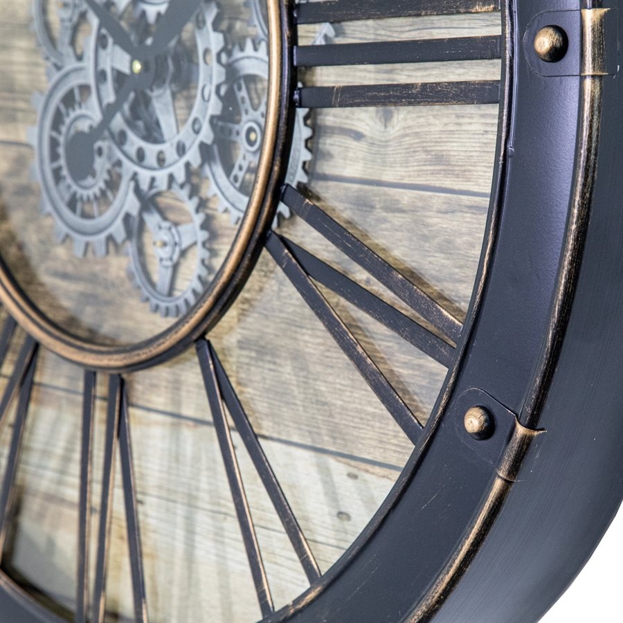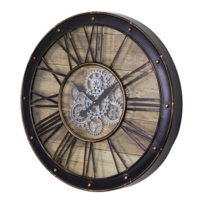 This clean contemporary styled wall clock features a glass face with a natural wood background with roman numerals. The black metal finished frame makes it great for modern or loft styled homes or a modern office. Moving gears add visual interest and a sense of ever-present dynamic motion of time. The dual movements require 3 AA batteries.