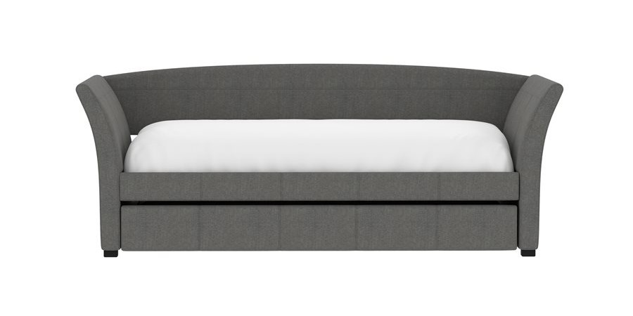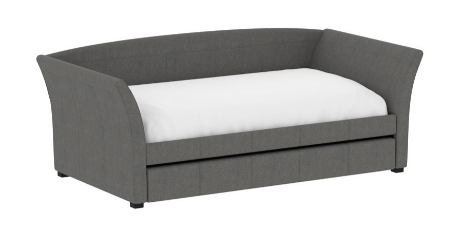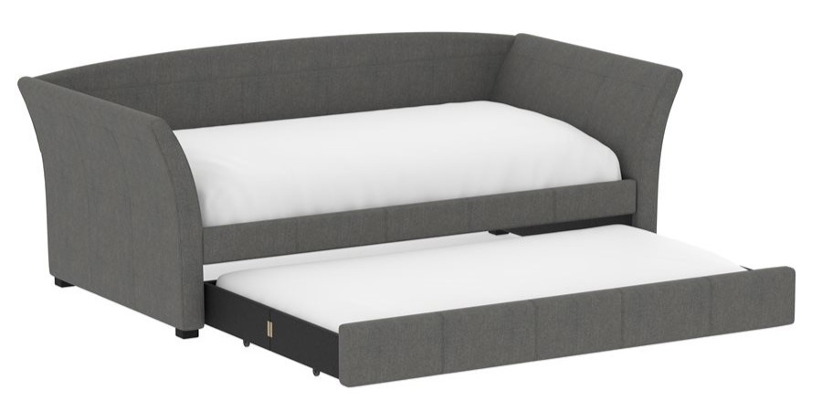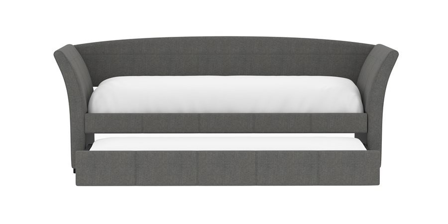 The Vienna daybed is a versatile addition to any space, whether it's a home office or a studio apartment. Its flared arms and gently curved back are upholstered in a gray woven fabric, offering a stylish look. By day, pile on the pillows to create the perfect lounging spot; by night, pull back the covers for a cozy bed. The convenient trundle pulls out effortlessly, serving as hidden storage with a divider bar or accommodating a second twin mattress for overnight guests. Enjoy the extra functionality and charm the Vienna daybed will bring to your home.