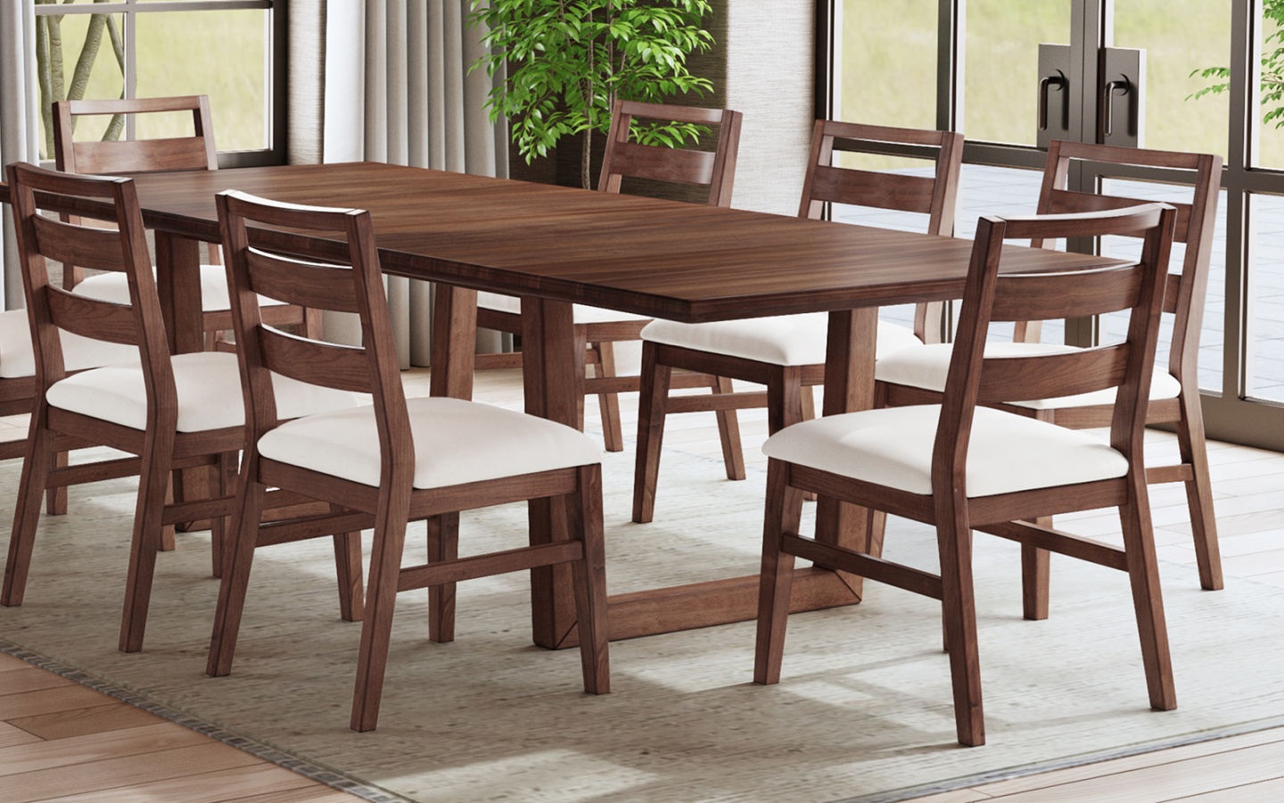 Voss Dining brings contemporary style home, where the focus of this collection is the natural beauty of the solid walnut wood. The table top has an inverted beveled edge which is slightly rounded, complimenting the open trestle design and shape. All pieces feature soft rounded edges, with beveled framing on the server. Hardware is minimal with a low profile to keep the focus on the wood.