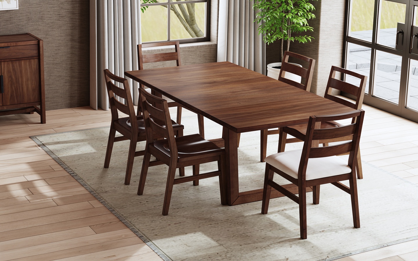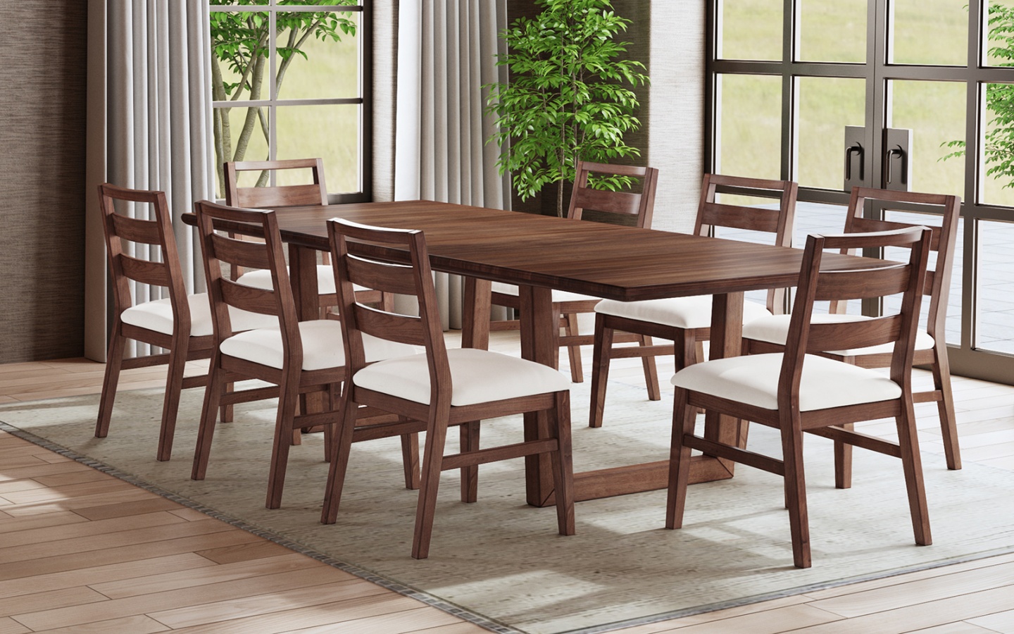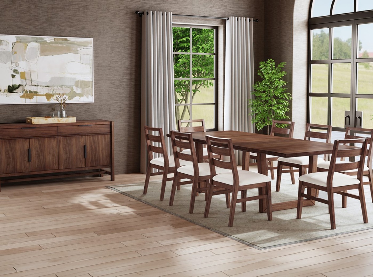 Voss Dining brings contemporary style home, where the focus of this collection is the natural beauty of the solid walnut wood. The table top has an inverted beveled edge which is slightly rounded, complimenting the open trestle design and shape. All pieces feature soft rounded edges, with beveled framing on the server. Hardware is minimal with a low profile to keep the focus on the wood.