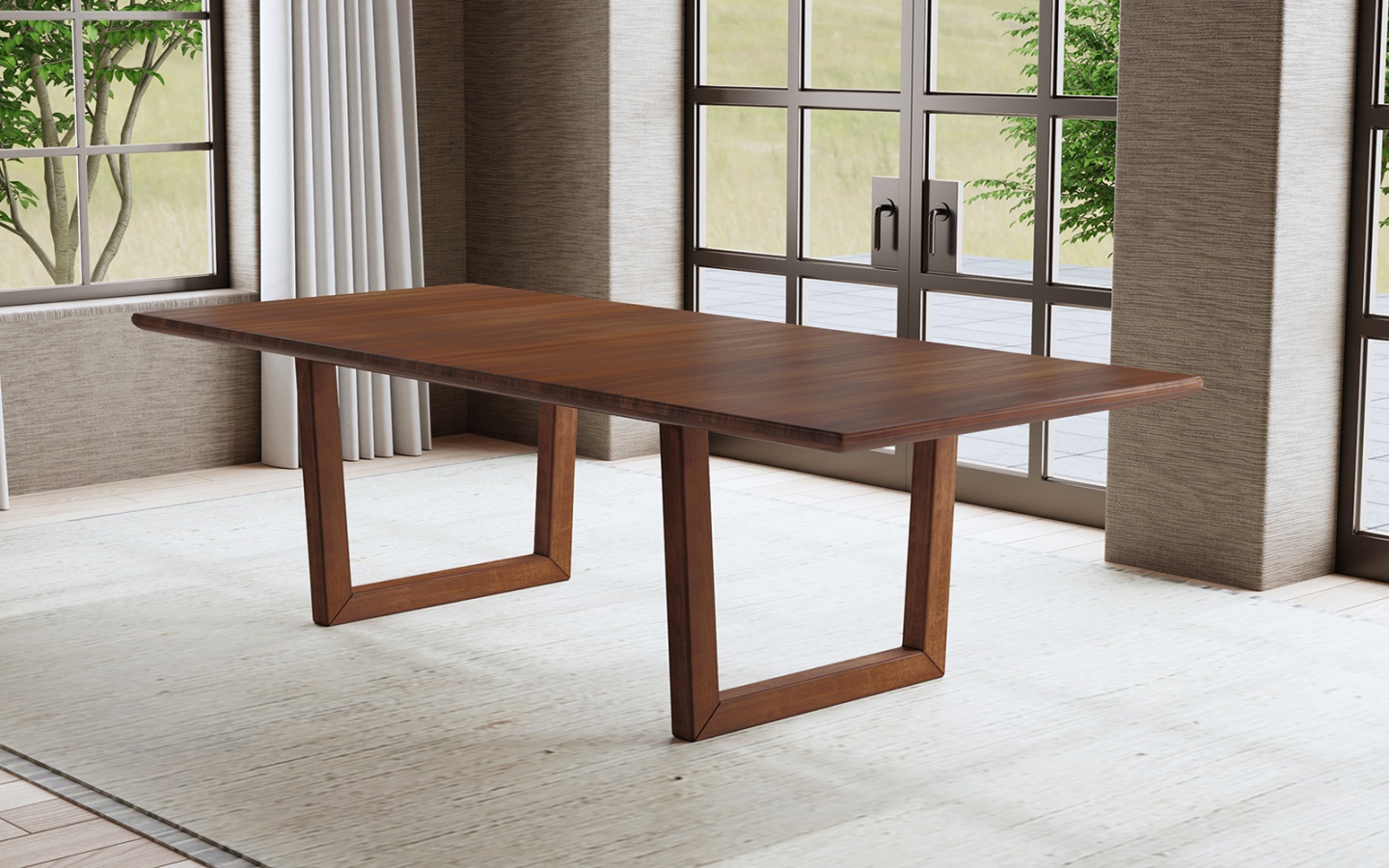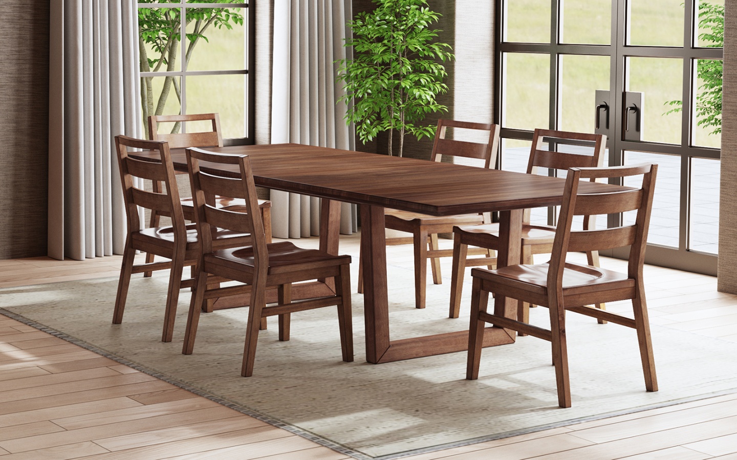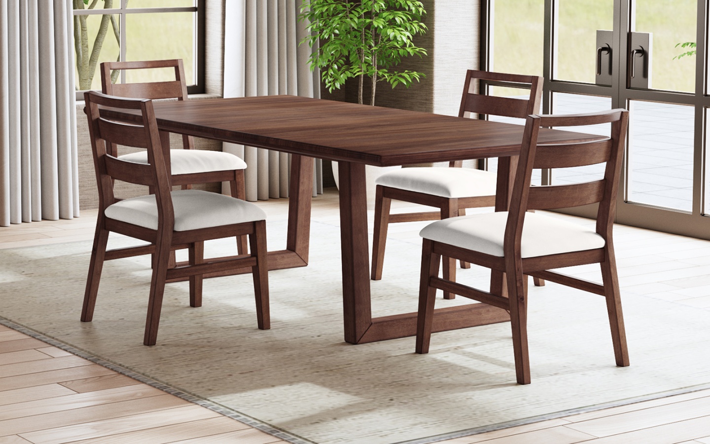 Voss Dining brings contemporary style home, where the focus of this collection is the natural beauty of the solid walnut wood. The table top has an inverted beveled edge which is slightly rounded, complimenting the open trestle design and shape. All pieces feature soft rounded edges, with beveled framing on the server. Hardware is minimal with a low profile to keep the focus on the wood.