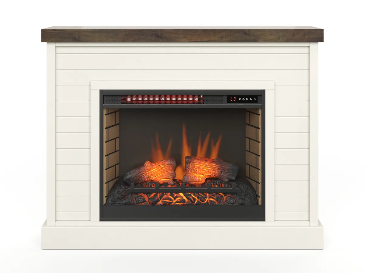 The Washington Fireplace Mantel combines coastal cottage charm with a touch of modern farmhouse flair. Its eye-catching Whitewash and Barnwood finish refreshes any space, making it a standout piece in your home decor. Equipped with a 28" fireplace insert, it warms spaces up to 400 sq ft, adding both warmth and ambiance.