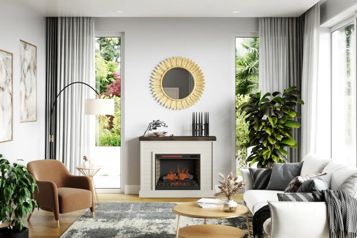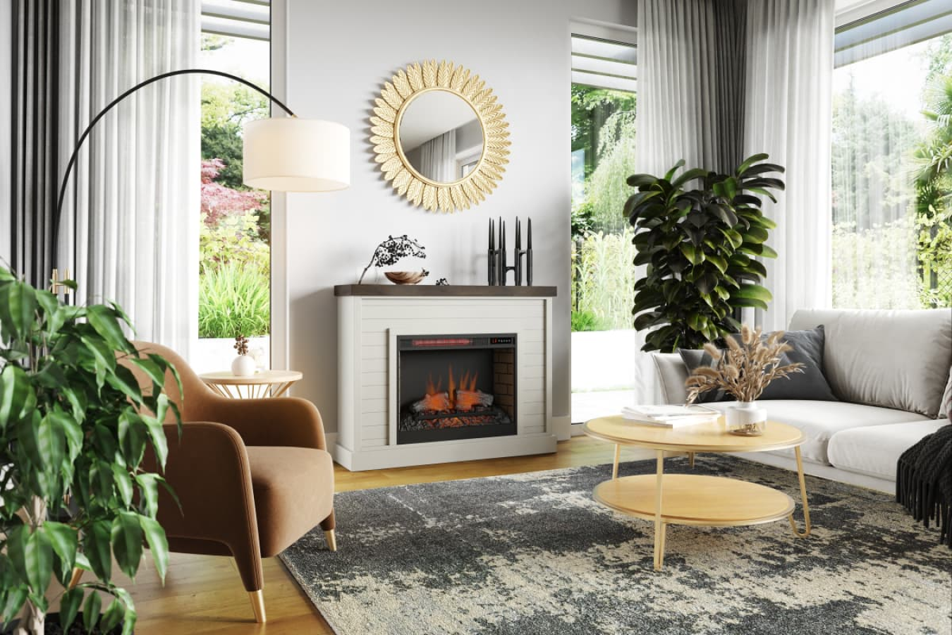 - Settings include adjustable flame brightness and flame effect without heat