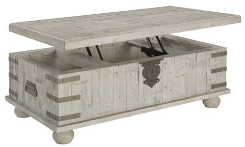 Unlock a quaint touch of farmhouse style and convenience in your living area with this lift top coffee table. Its design is inspired by the rugged looks of an antique storage trunk. Metal keyhole and bracket accents with rivets, a planked effect and large recessed bun feet dress up this charming piece. The distressed light gray finish enhances the wood's natural grain, which delivers a naturally aged feel. You’ll love its generous scale, offering a roomy top that's ideal for displaying accents and more. Lift the top and enjoy the accommodating work or dining surface. Under the lift top, there's a fully finished storage area—deeply spacious for organization.